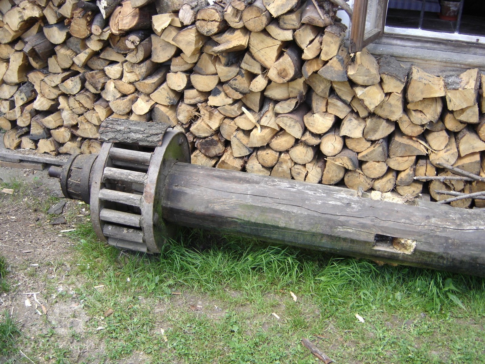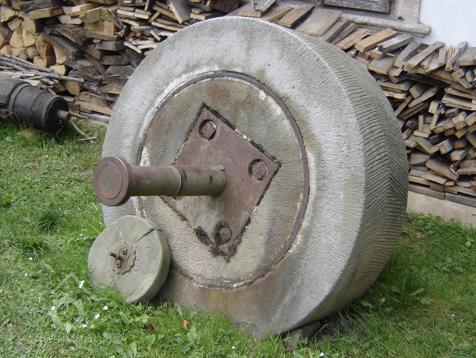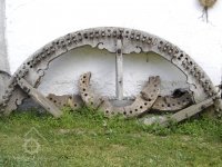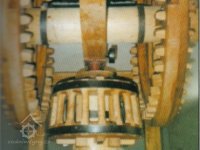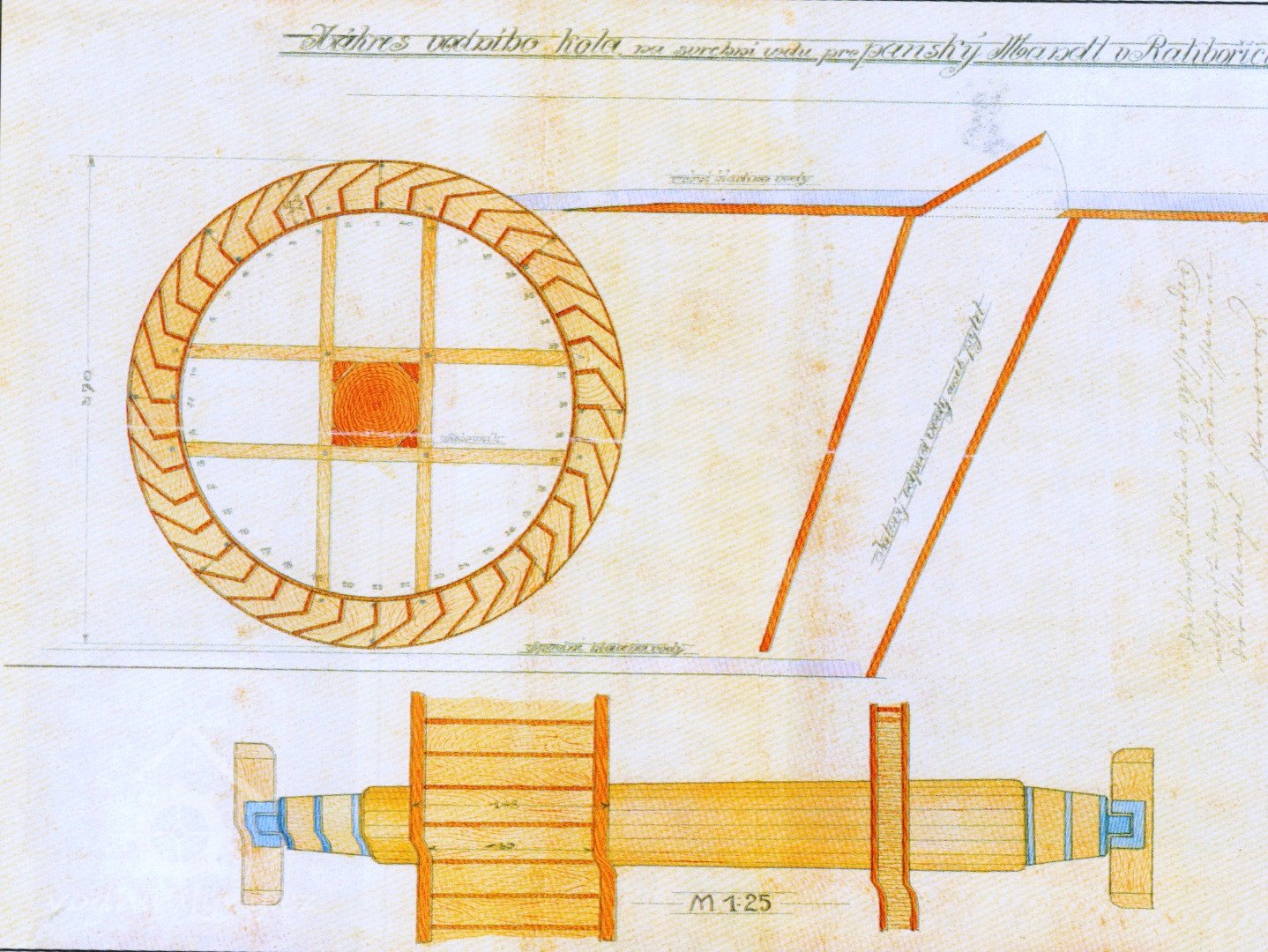 se dřevěnými palci, železného hřídele s pastorkem a 2 železnými lůžky, prázdným (volnoběžná řemenice) a hnaným kotoučem.“