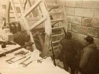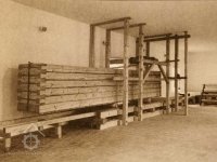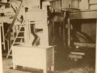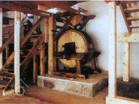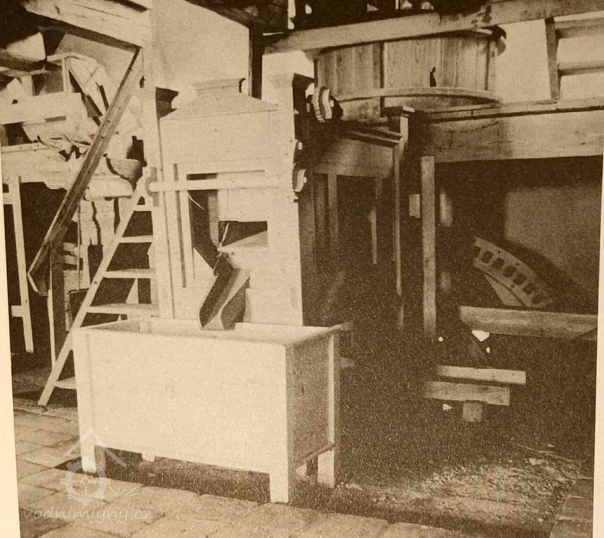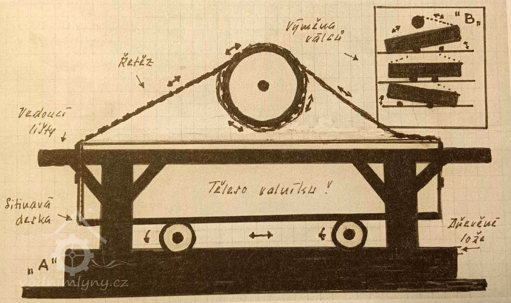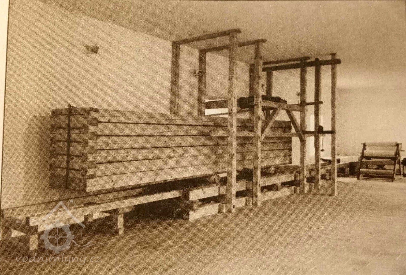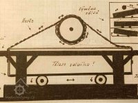 „4. Valník se 2 plotnami, spodní z jasanových špalíčků, vrchní kovová, spodní podstavec z dubového dříví, dubový hřídel se 2 řetězy (nad valníkem k jeho pohybu) a vyrukovadlem (svislá páka k ovládání mandlu). Strojové zařízení na kovovém podstavci sestává z kovového palečního kola