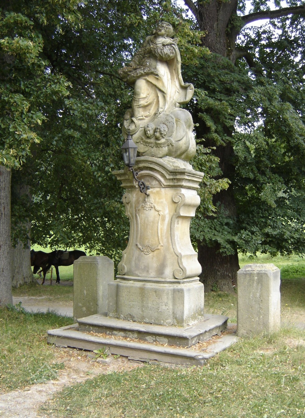 Na dvou stupních sokl nesoucí stylobat projmutý po stranách vlnovkou, zakončenou volutami. Římsa rovná, ve středu vypjatá - tvoří podnož sochy P. Marie plující na obláčku a půlměsíci s andílky. Po stranách stylobatu se sochou dva hranolové patníky. Ve středu podstavce kartuš s monogramem Maria. Na soklu datum 1796. "Postaveno nákladem Ant. Ludra - Anny manželky - dat.“
