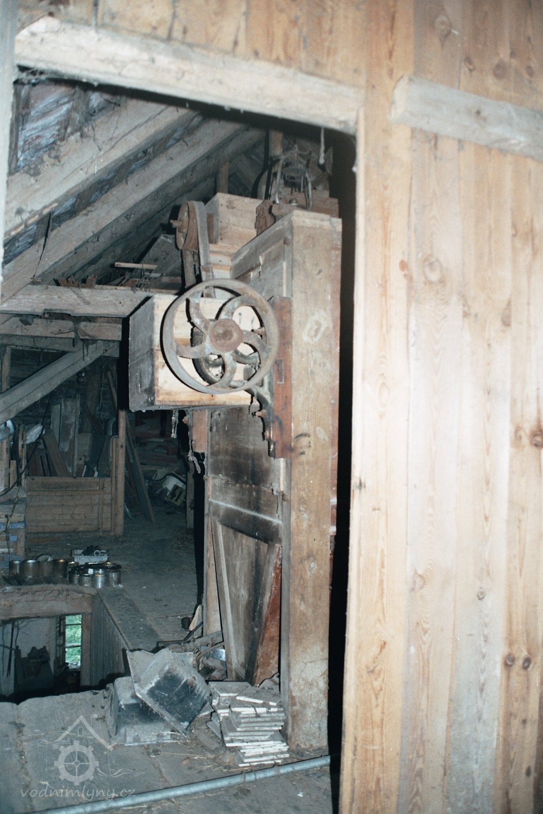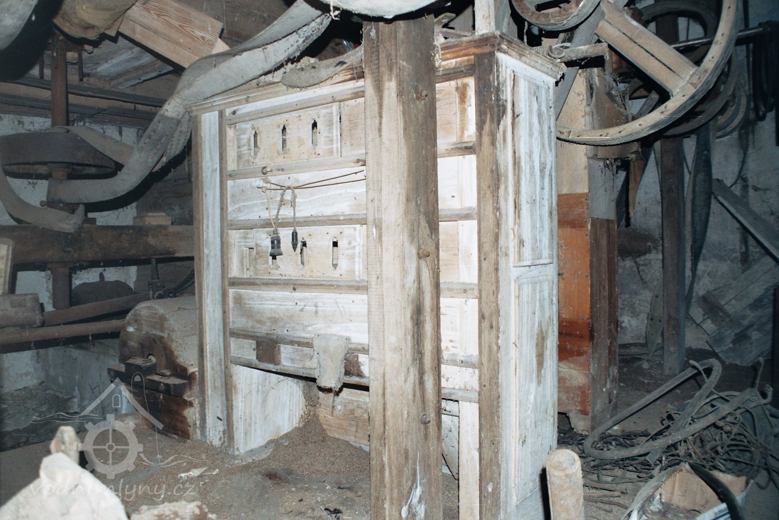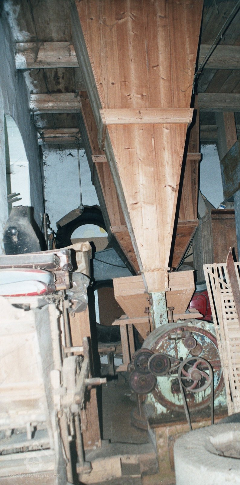 Od velkého vodního kola procházela do mlýnice dřevěná hřídel, která otáčela nejprve větším čelním pal. kolem a to pak otáčelo přes cévník další dřevěnou hřídel s bočním palečním kolem. Boční kolo pohánělo vertikální hřídel mlecího složení kamenů a horizontálně pastorek s litinovou řemenicí, jenž dále roztáčela transmisí v podkolí, uchycenou u na trámech. Transmise pak poháněla všechny stroje a ještě malou transmisi pod střechou, dále druhé složení kamenů přes zkřížený řemen a krupník. Čelní paleční kolo ještě roztáčelo pastorek s dřevěnou řemenicí, na kterou se dle potřeby nahazoval řemen pro transmisi vedoucí do stodoly pro pohon doplňkových a zemědělských strojů. V podkolí se nachází pěkná zdobená moučnice s prosévacím zařízením. Unikátem pak je zde malá jednoduchá štoska čistící jáhly popřípadě i hrubou krupici. Je zde i pěkně zachovaný krupník. Mlýnská hranice je řemeslně zdobená. Na první podlaze stojí válcová stolice s dřevěnou skříní a rýhovanými válci. Vyrobená byla na konci 19. stol. pravděpodobně firmou J. Hübner a K. Opitz - Pardubice cca r. 1892 - 1895. Vedle je malá periodická loupačka a kamenné mlecí složení. Ještě je zde francouzké mlecí složení. Patry prochází několik kapsových dopravníků a pod střechou je velký moučný hranolový vysévač, čistící hranolový vysévač s koukolníkem, malá reforma a šnekový dopravník.