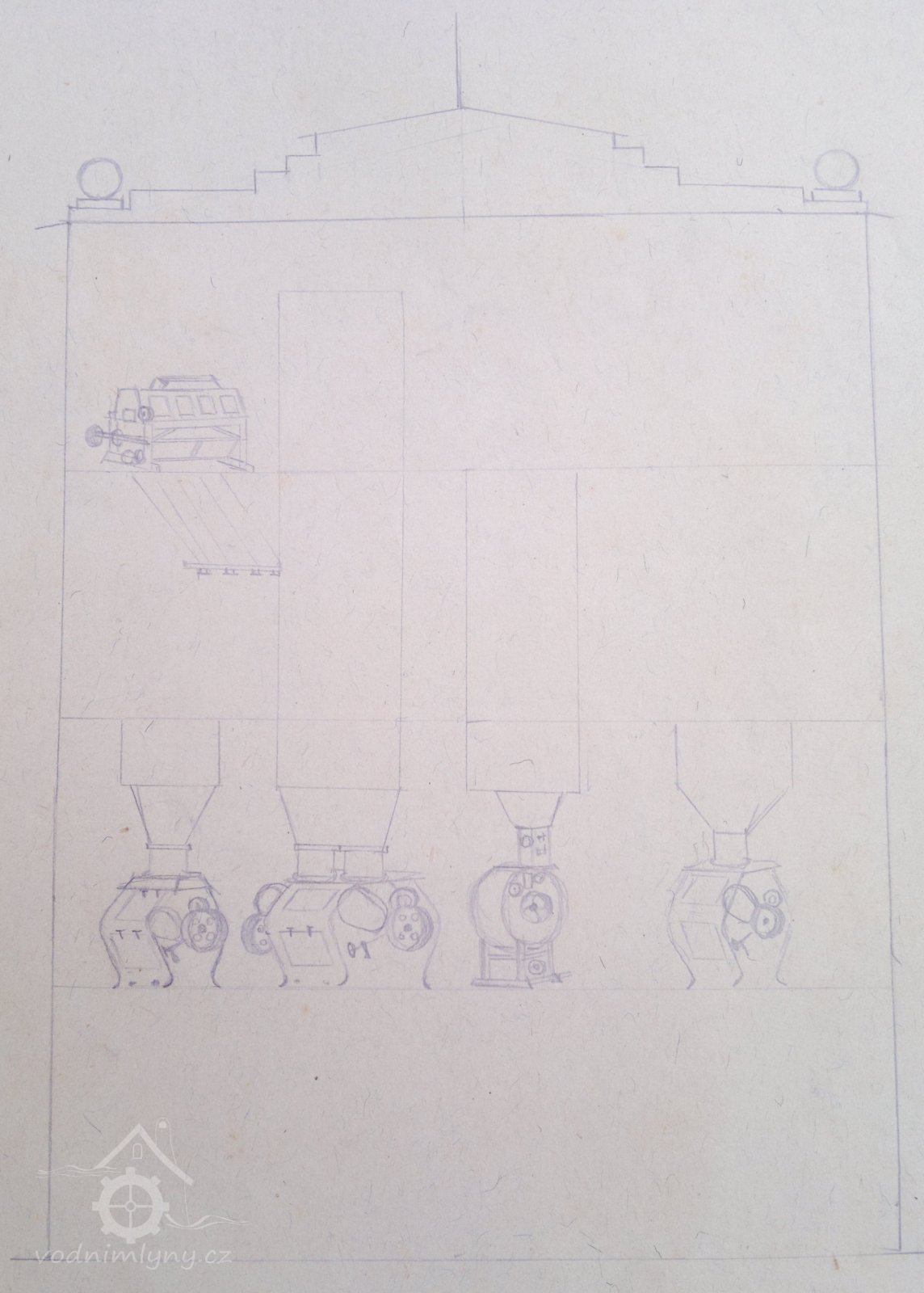 PopisMlýn měl velké vodní kolo na vrchní vodu o diametru asi 6,7 metrů. Hřídel a všechny části dřevěné.