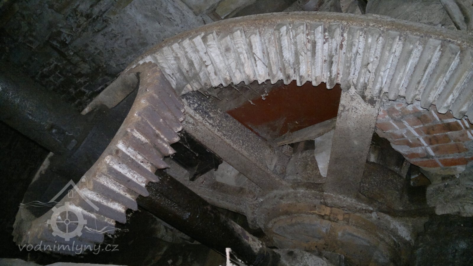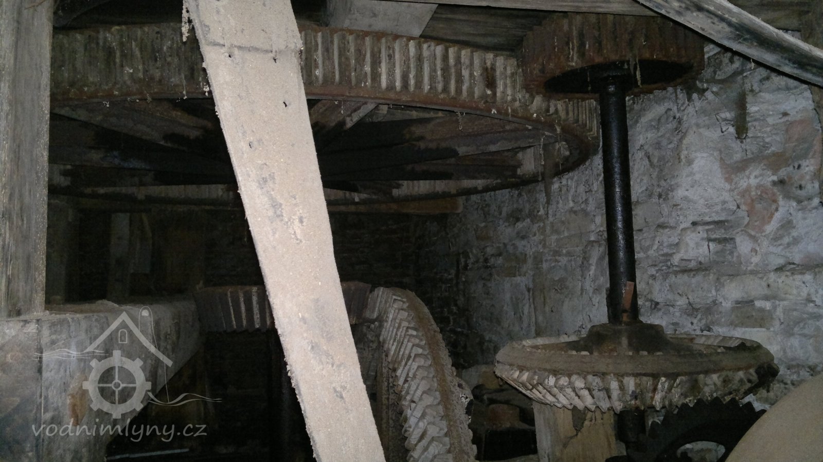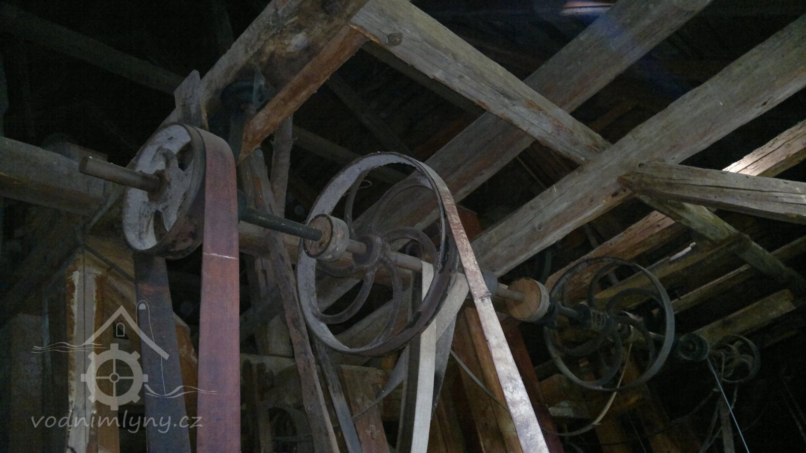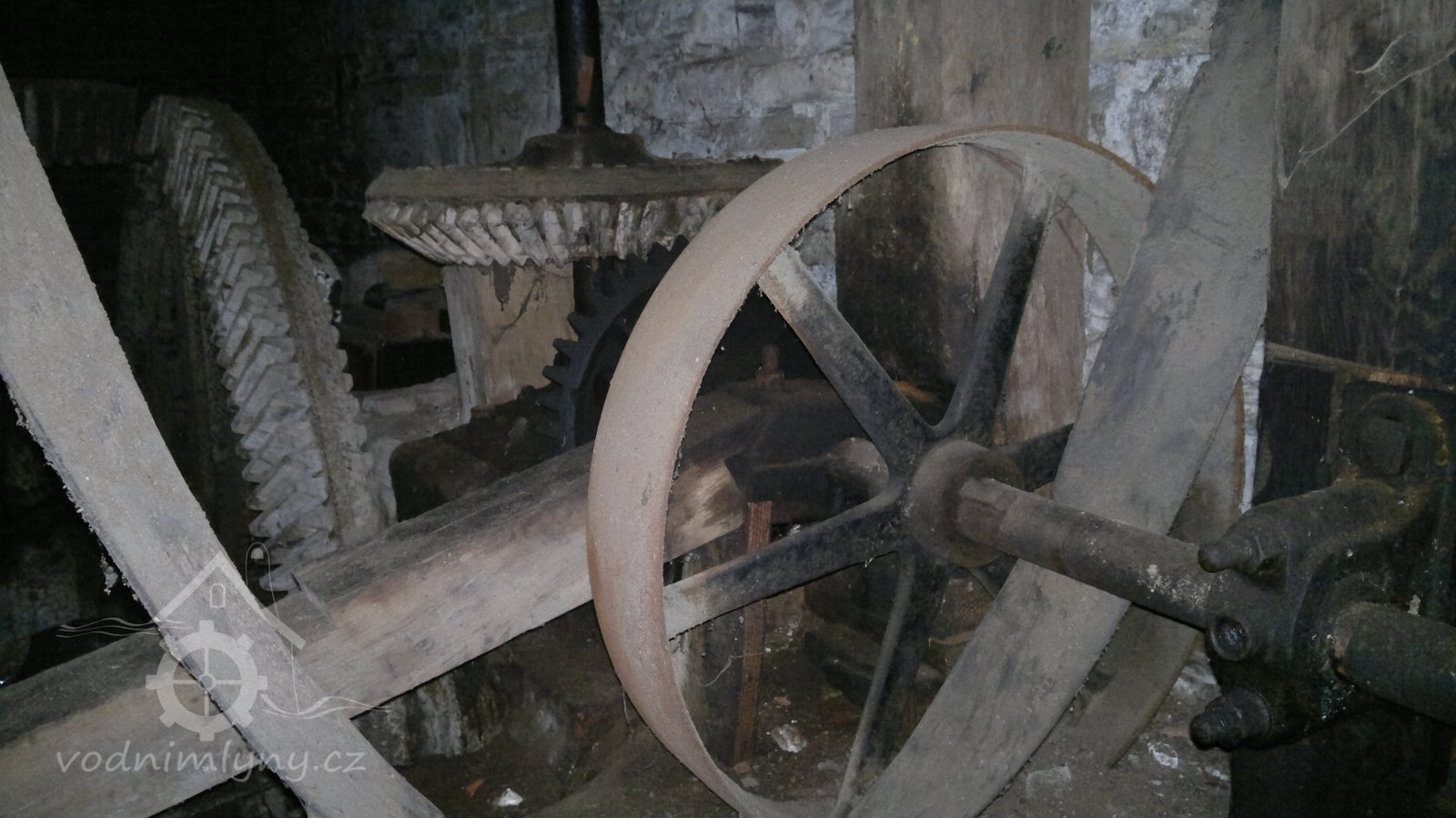 Od vodního kola prochází dřevěná hřídel otvorem do spodního prostoru mlýna – podkolí. Na hřídeli je osazen na dřevěných ramenách litinový věnec s dřevěnými bočními palci (hlavní paleční kolo). Tyto palce zapadají do pastorku. Pastorek nasazený na vertikální kovové hřídeli a tvoří s palečním kolem pravoúhlý převod. Na této kovové hřídeli osazeno též čelní litinové paleční kolo, jehož palce zapadají do dvou samostatných pastorků. První pastorek roztáčel svislou (vertikální) hřídel kamenného mlecího složení, které sloužilo k domílce. Druhý pastorek otáčel taktéž další svislou hřídelí. Tato hřídel prochází několika podlažími a nazývá se královská. Od ní pak pomocí dalších pravoúhlých převodů roztáčeny rozvodové transmise jdoucí do prostoru mechanické tkalcovny, barevny a valchy mimo mlýnici. Na úplně spodní části této hřídele (v podkolí) se nachází malý pravoúhlý převod k pohonu hlavní horizontální (vodorovné) transmise k roztáčení mlýnských strojů na prvním podlaží a v podkolí. Také roztáčela další rozvodové transmise v mezipatře a pod střechou přes kožené ploché řemeny a odtud pak poháněny jednotlivé mlýnské stroje ve vyšších patrech.