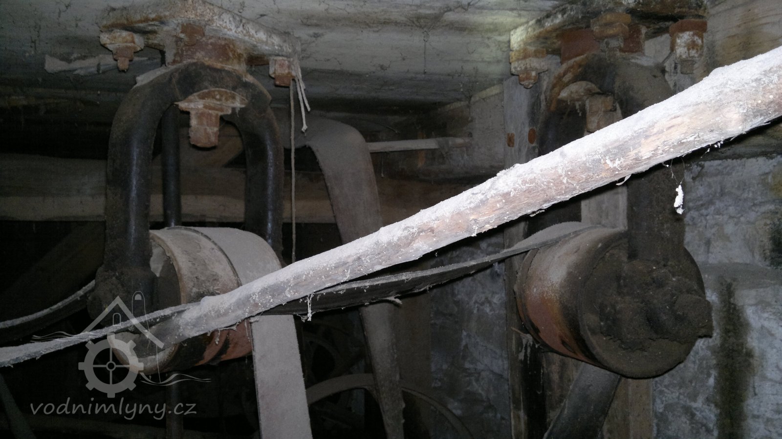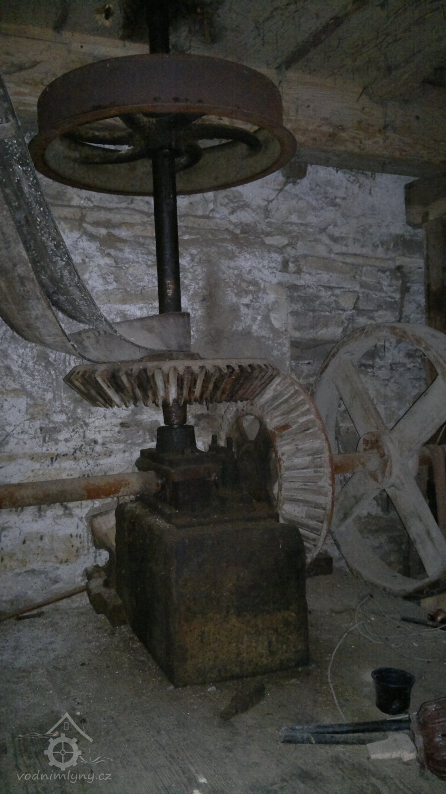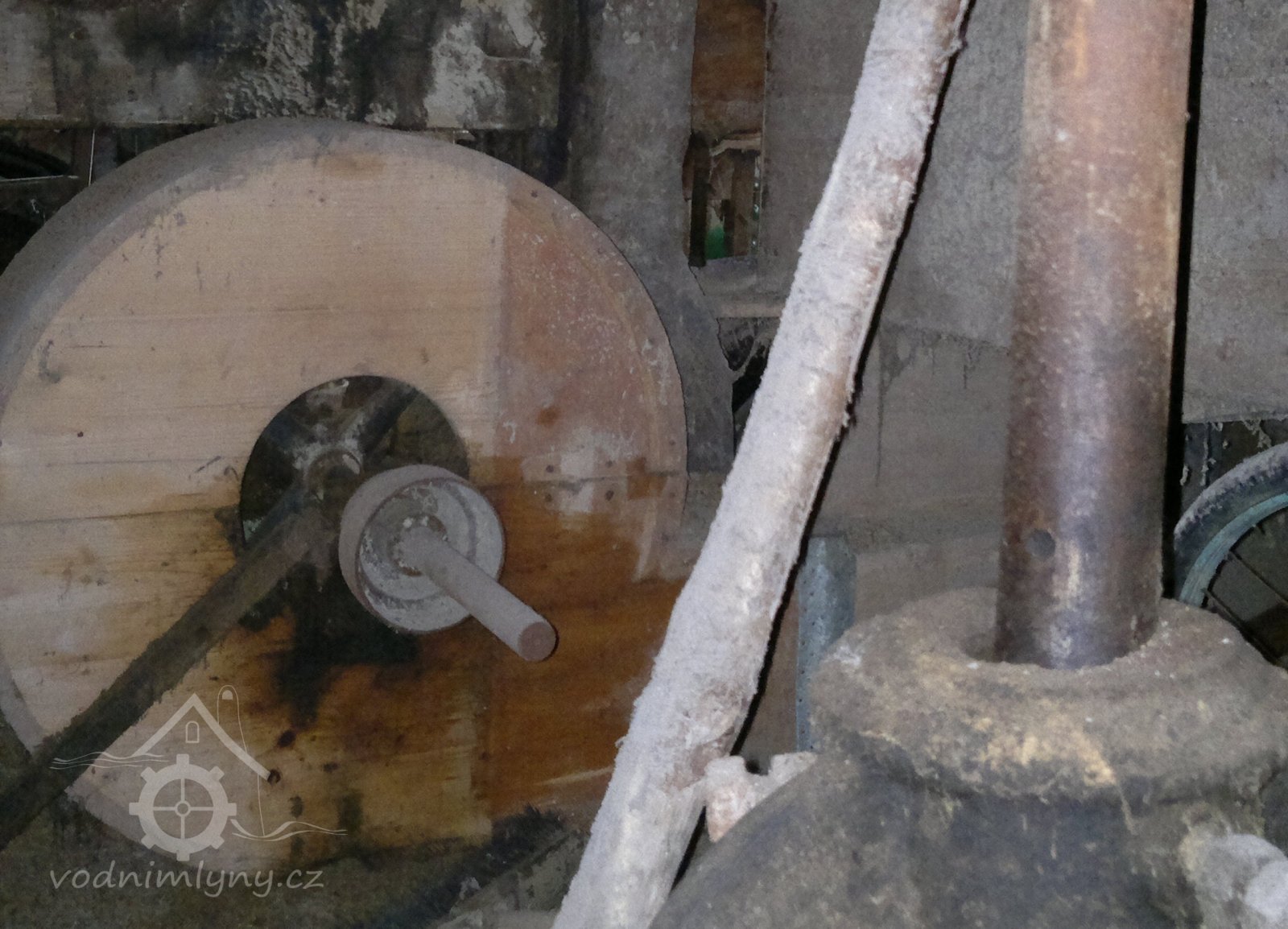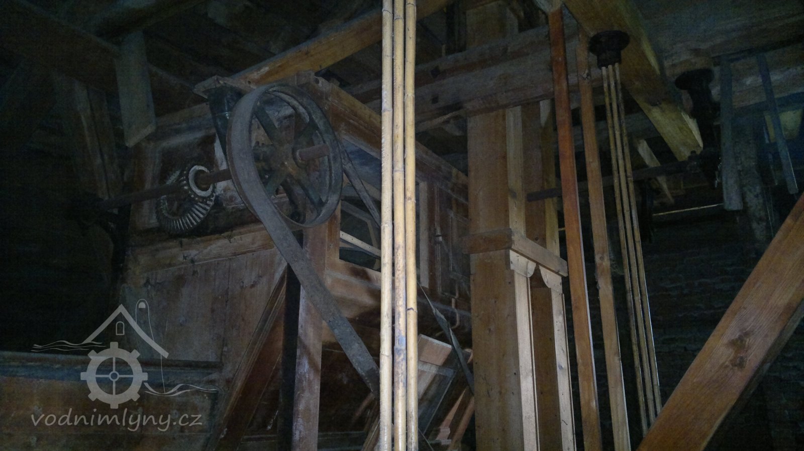 Od vodního kola prochází dřevěná hřídel otvorem do spodního prostoru mlýna – podkolí. Na hřídeli je osazen na dřevěných ramenách litinový věnec s dřevěnými bočními palci (hlavní paleční kolo). Tyto palce zapadají do pastorku. Pastorek nasazený na vertikální kovové hřídeli a tvoří s palečním kolem pravoúhlý převod. Na této kovové hřídeli osazeno též čelní litinové paleční kolo, jehož palce zapadají do dvou samostatných pastorků. První pastorek roztáčel svislou (vertikální) hřídel kamenného mlecího složení, které sloužilo k domílce. Druhý pastorek otáčel taktéž další svislou hřídelí. Tato hřídel prochází několika podlažími a nazývá se královská. Od ní pak pomocí dalších pravoúhlých převodů roztáčeny rozvodové transmise jdoucí do prostoru mechanické tkalcovny, barevny a valchy mimo mlýnici. Na úplně spodní části této hřídele (v podkolí) se nachází malý pravoúhlý převod k pohonu hlavní horizontální (vodorovné) transmise k roztáčení mlýnských strojů na prvním podlaží a v podkolí. Také roztáčela další rozvodové transmise v mezipatře a pod střechou přes kožené ploché řemeny a odtud pak poháněny jednotlivé mlýnské stroje ve vyšších patrech.