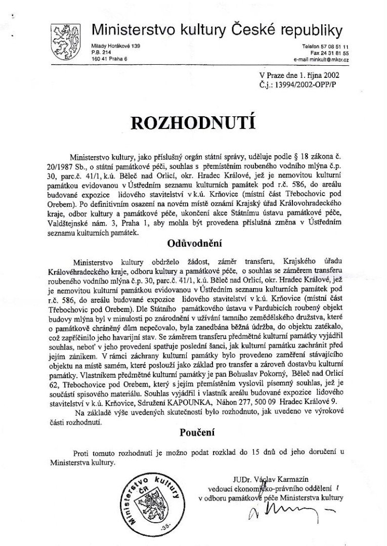 Ministerstvo kultury, jako příslušný orgán státní správy, uděluje podle § 18 zákona č. 20/1987 Sb., o státní památkové péči, souhlas s přemístěním roubeného vodního mlýna č.p. 30, parc.č. 41/1, k.ú. Běleč nad Orlicí, okr. Hradec Králové, jež je nemovitou kulturní památkou evidovanou v Ústředním seznamu kulturních památek pod r.č. do areálu budované expozice lidového stavitelství v k.ú. Krňovice (místní část Třebochovic pod Orebem). Po definitivním osazení na novém místě oznámí Krajský úřad Královohradeckého kraje, odbor kultury a památkové péče, ukončení akce Státnímu ústavu památkové péče, Valdštejnské nám. 3, Praha 1, aby mohla být provedena příslušná změna v Ústředním seznamu kulturních památek.