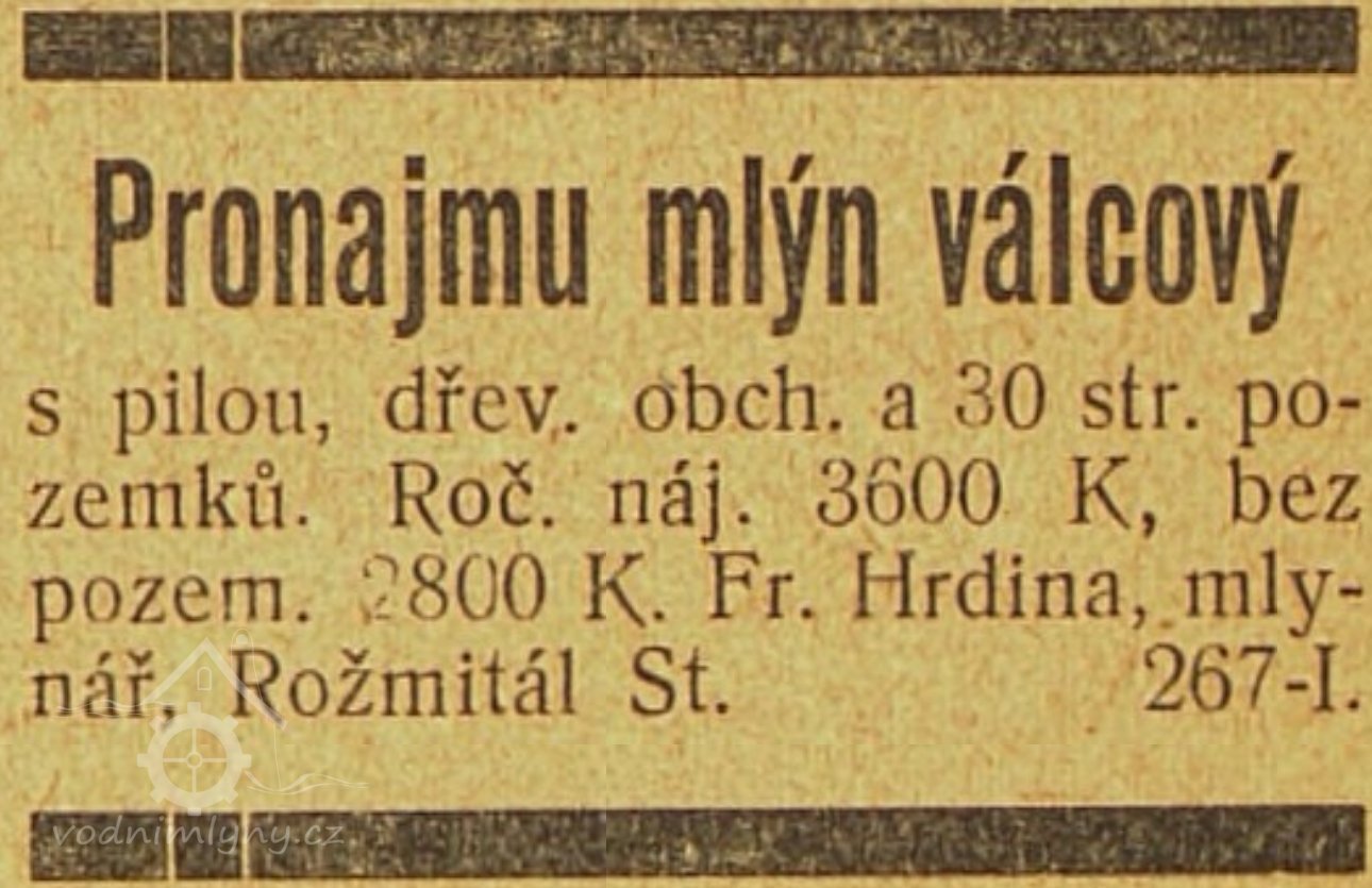 Popis1930: 2 kola na svrchní vodu, hltnost 0,14 m3/s a 0,201 m3/s, spád obou 4,5 m, celk. výkon 13,4 HP