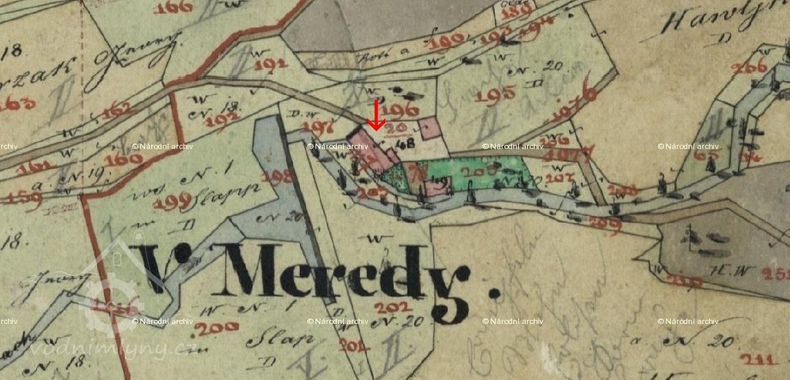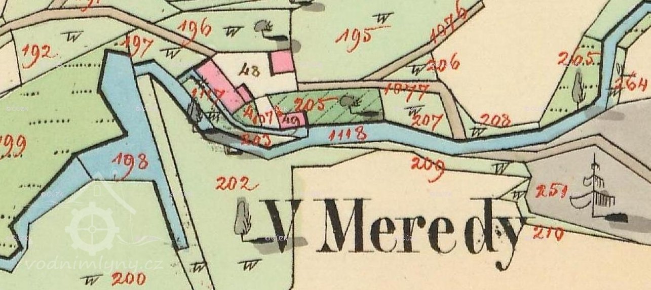 PopisV r. 1930 zde bylo 1 kolo na svrchní vodu, průtok 0,07 m3/s, spád 5,1 m, výkon 3 k.