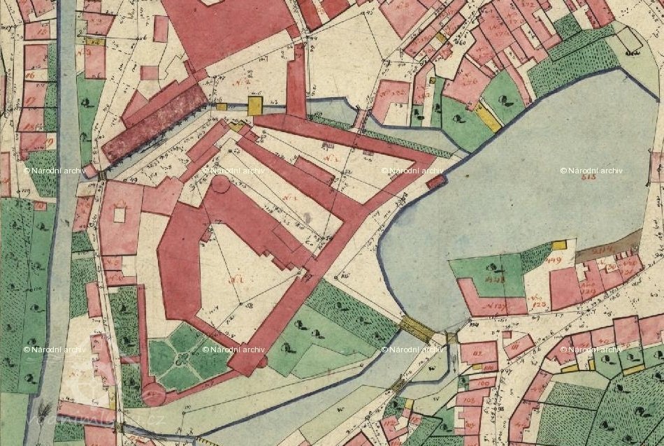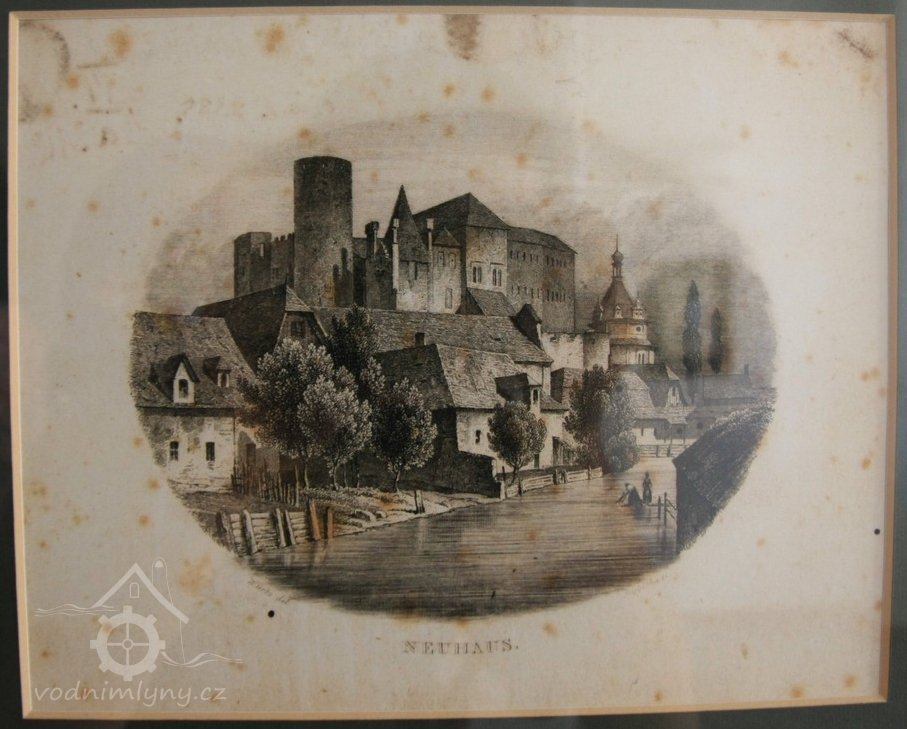 6.12.1845 popis mlýna: Mlýn se 14 složeními čp. 3 v zámeckém obvodu je zbudován masivně a krytý šindelem, 23 1/3´ [53,8 m] dlouhý, 7 1/6´ [13,6 m] široký. Při průčelní stěně vede šindelem pokrytá 2 2/3´[5,05 m] dlouhá, 1 5/6´ [3,47 m] široká sloupová předsíň po 14 kamenných stupních dolů do mlýnice se 14 mlýnskými složením a jednou stoupou na kroupy, s prkenným stropem a cihelnou podlahou a pod ležatou střešní vazbou krov vesměs s fošnovou podlahou. Mlynářovo obydlí, přistavěné při dlouhé zadní stěně mlýnské budovy a kryté šindeli, je dlouhé 14 1/3´[23,17 m] a přibližně 3´[5,68 m] široké, má vstup z dolního prostoru mlýna do klenuté předsíně, jakož i do klenuté kuchyně, vedle vpravo je klenutá, prkny pokrytá vytápěná šalanda a vlevo jsou dvě klenuté a prkny pokryté, vytápěné obývací světnice, jakož i klenutá komora. Stáj za 14.776 zl. konv. m.