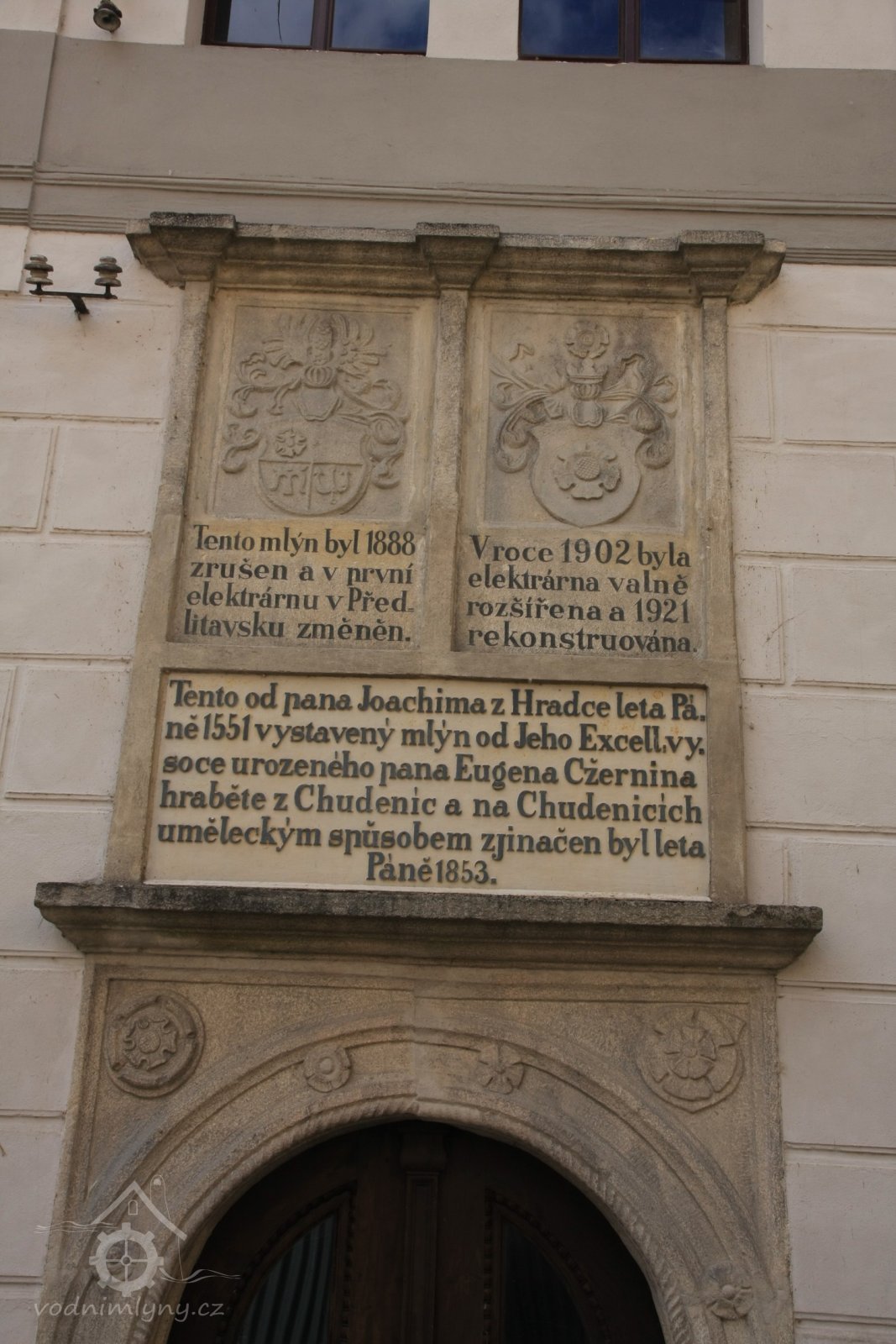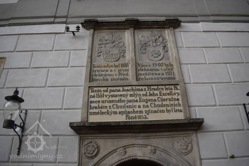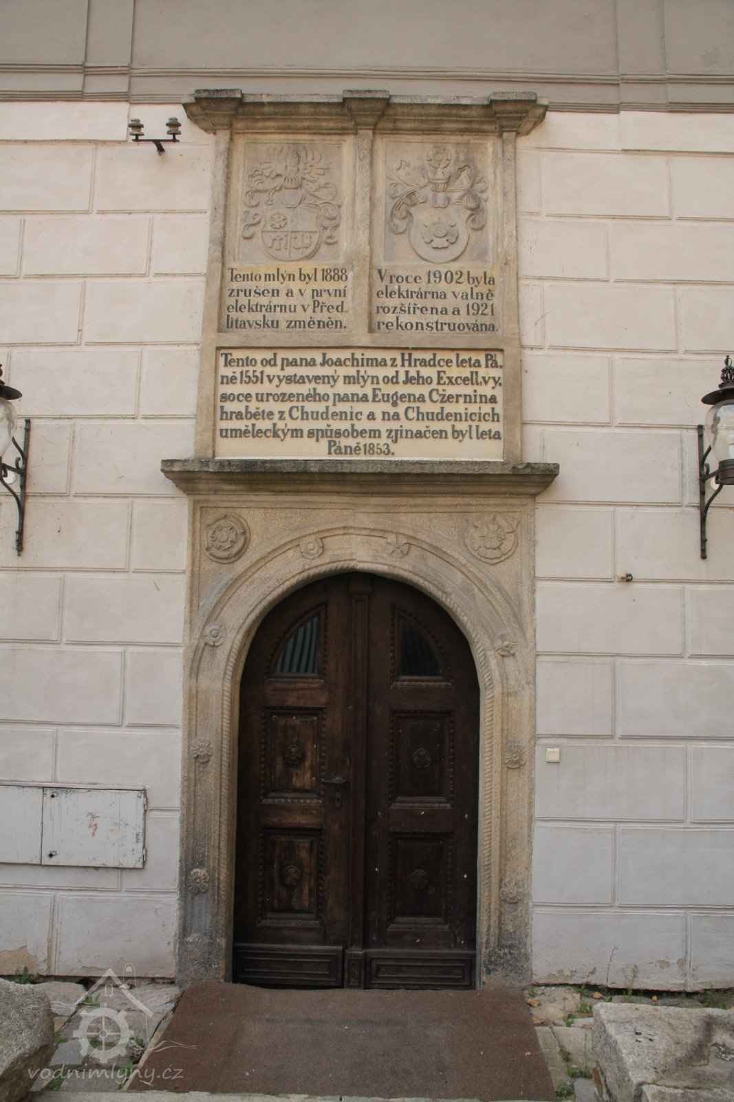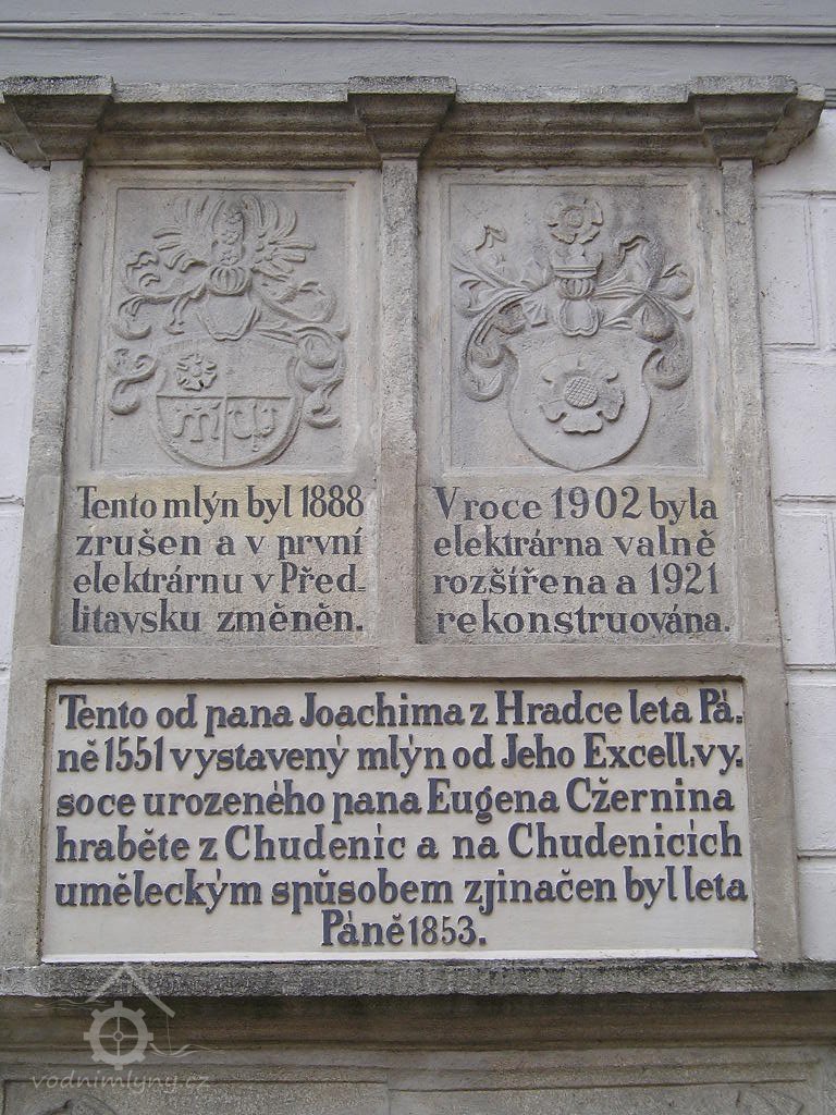 Nad hlavním vchodem plechová deska: "Tento od pana Joachima z Hradce léta Páně 1551 vystavěný mlýn od jeho Excell. vysoce urozeného pana Eugena Czernina, hraběte z Chudenic a na Chudenicích, uměleckým způsobem zjinačen byl léta Páně 1853".