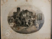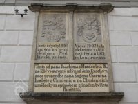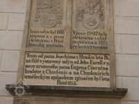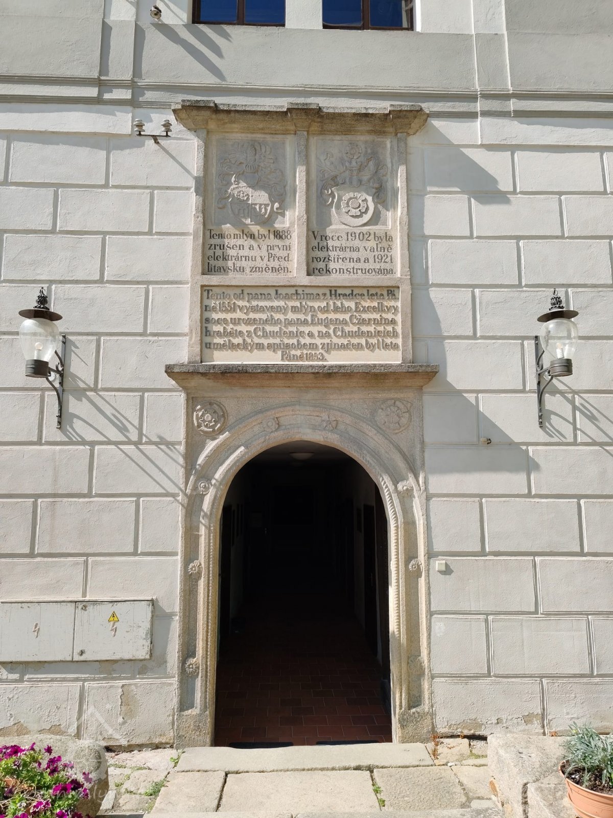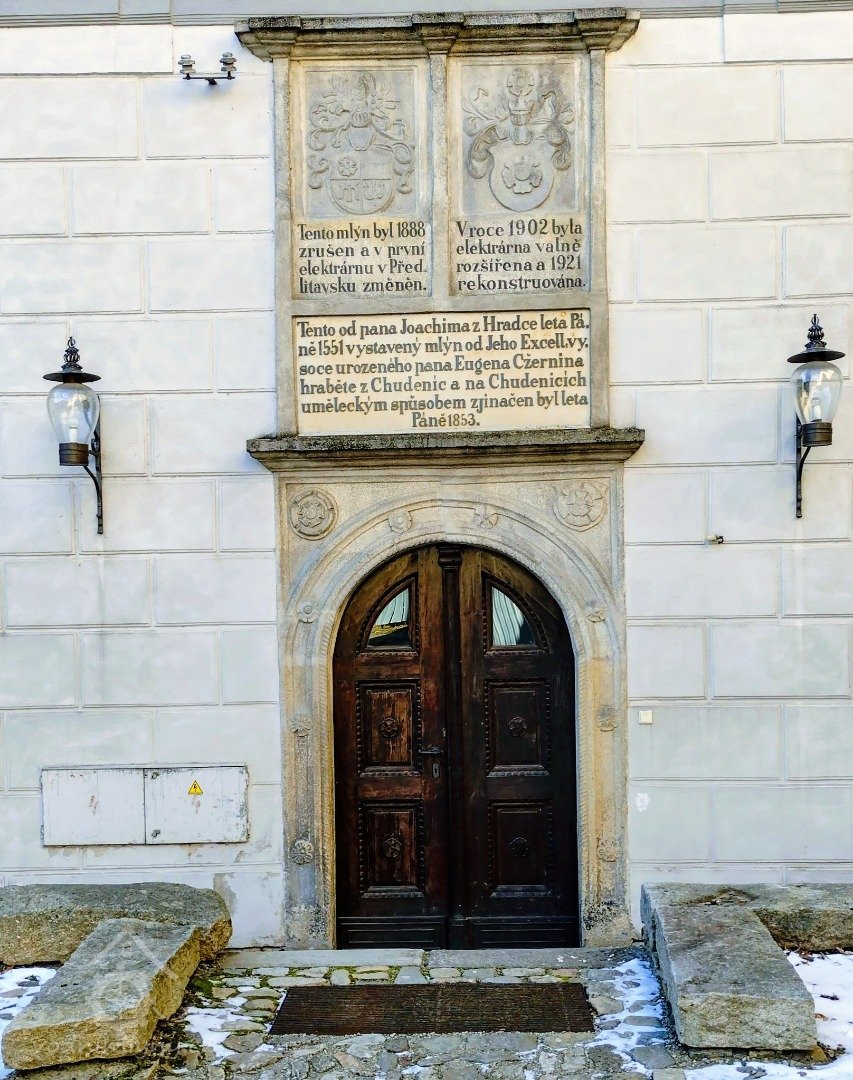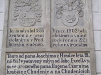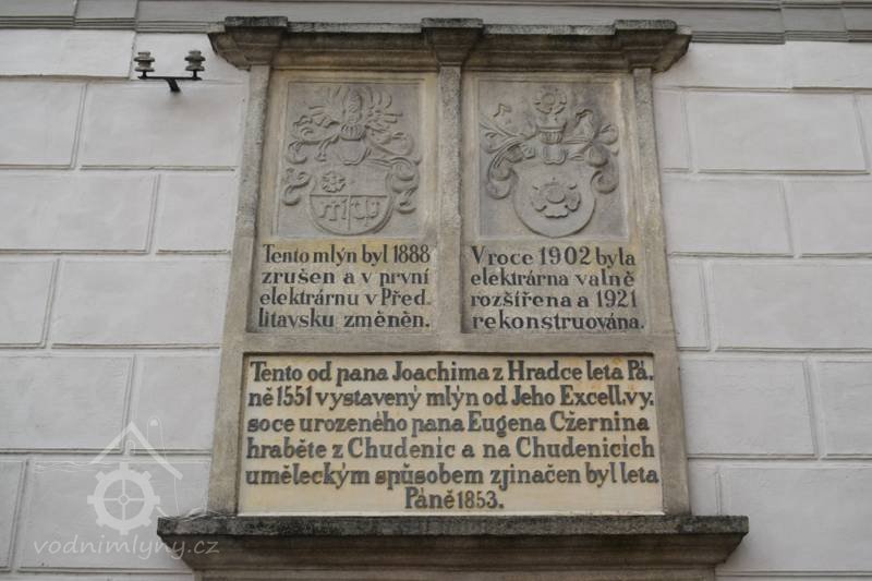 Nad hlavním vchodem plechová deska: "Tento od pana Joachima z Hradce léta Páně 1551 vystavěný mlýn od jeho Excell. vysoce urozeného pana Eugena Czernina, hraběte z Chudenic a na Chudenicích, uměleckým způsobem zjinačen byl léta Páně 1853".