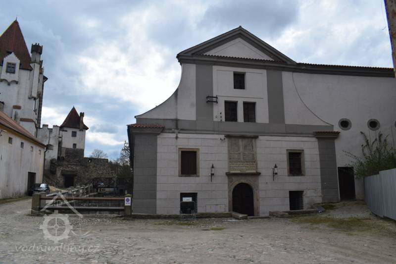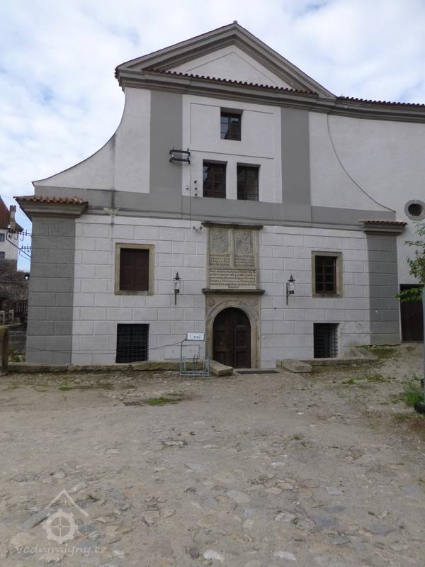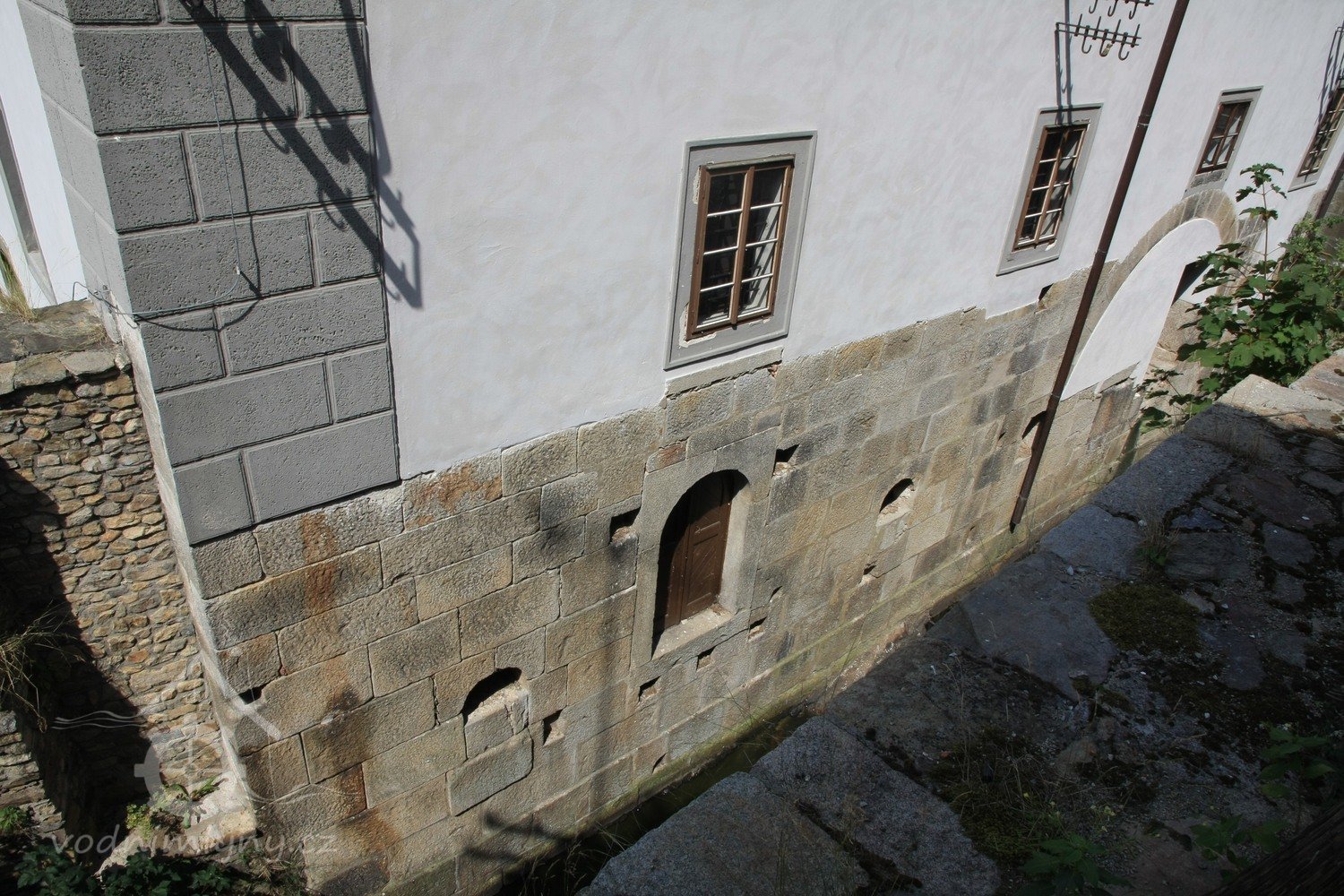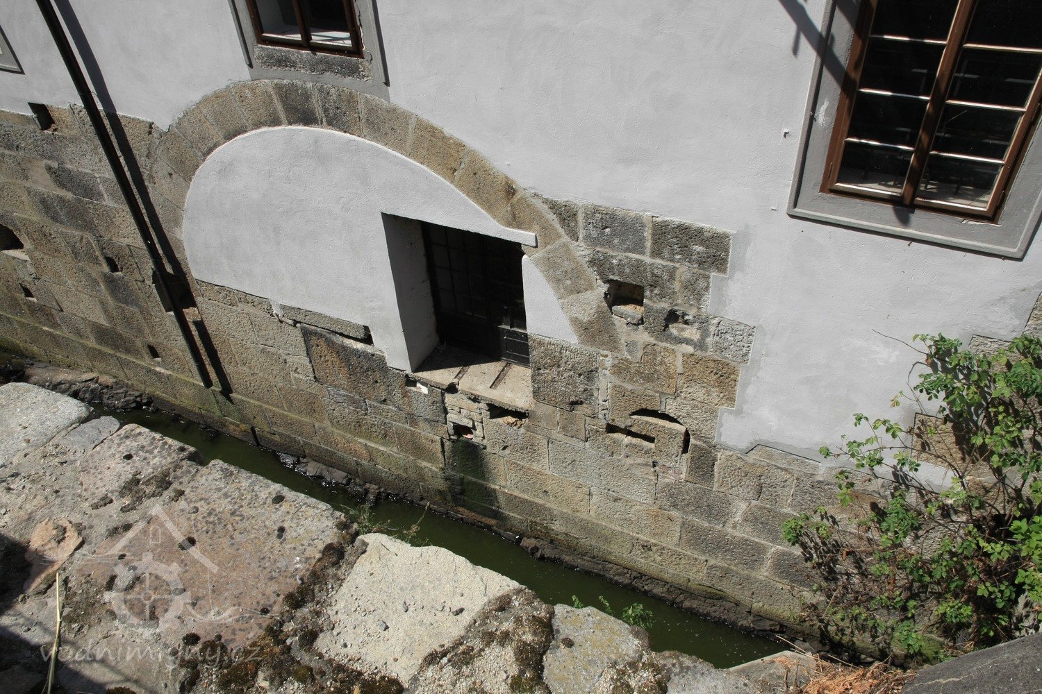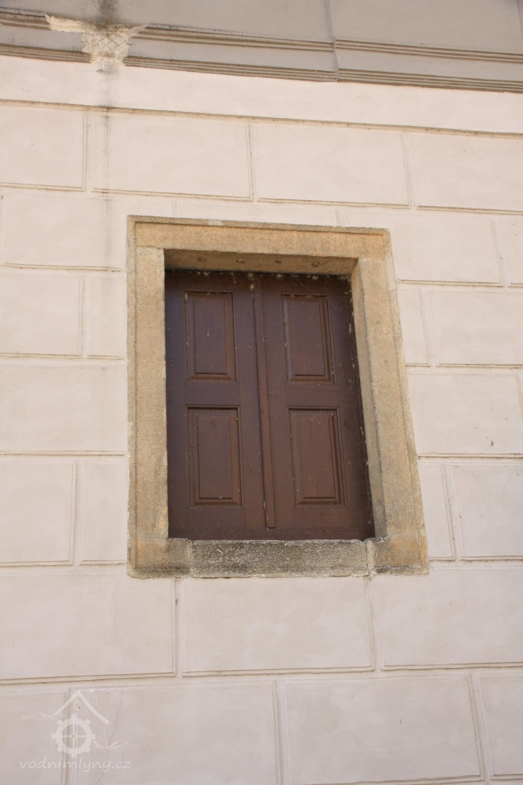 Mlýn o čtrnácti složeních. V průčelí kamenné obložení. Vnitřní obložení ozdobeno pětilistými růžemi ve vyhloubeném žlábku. Stejně profilovaná vrata i vně, ale na hraně se šroubovitým prutem. Nad obložením vodorovná římsa, pod níž v rozích po stranách archivolty hradecká a rožmberská růže. Nad římsou jsou žulové desky, na nichž pod římsou vytesané znaky Jáchyma a Anny z Rožmberka.