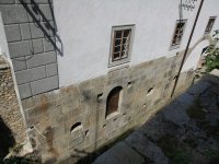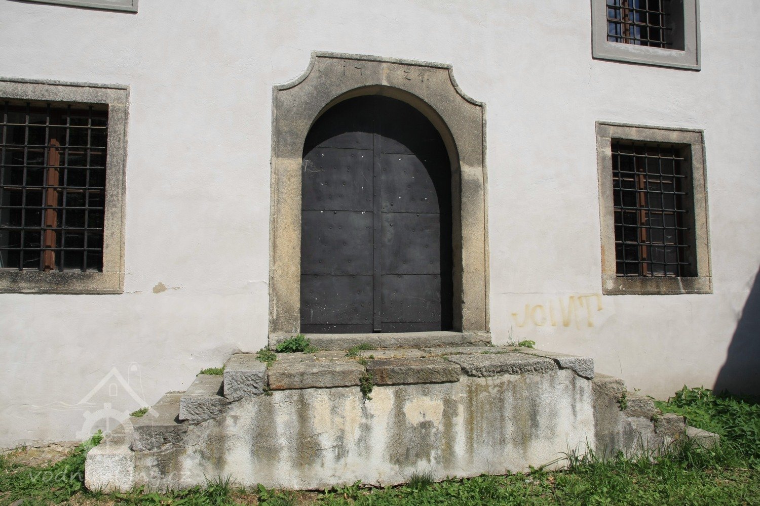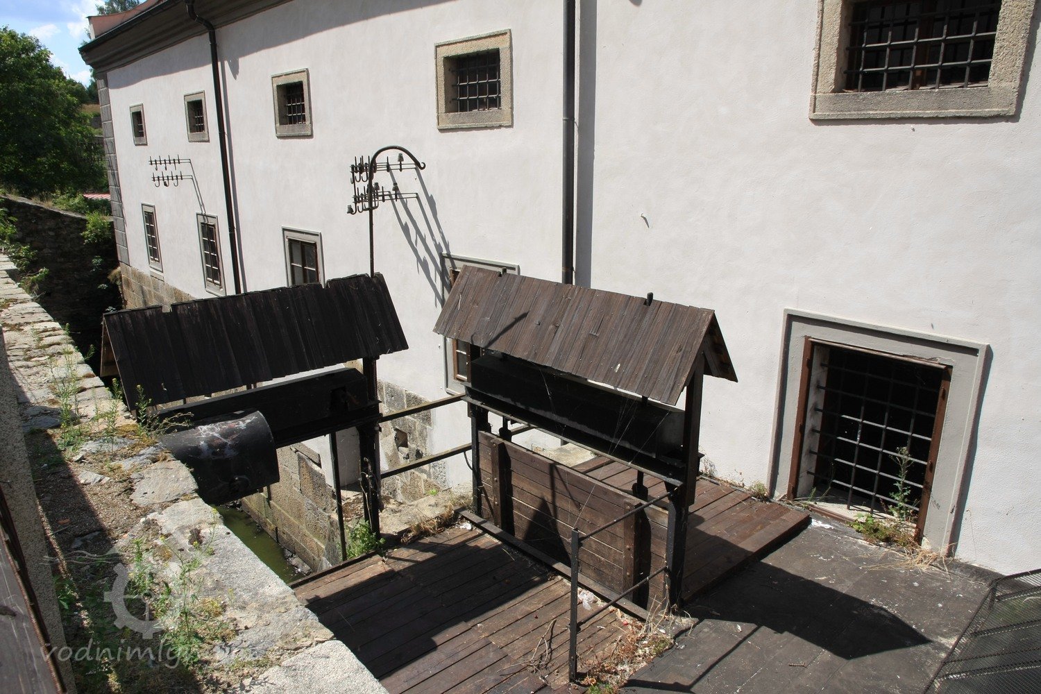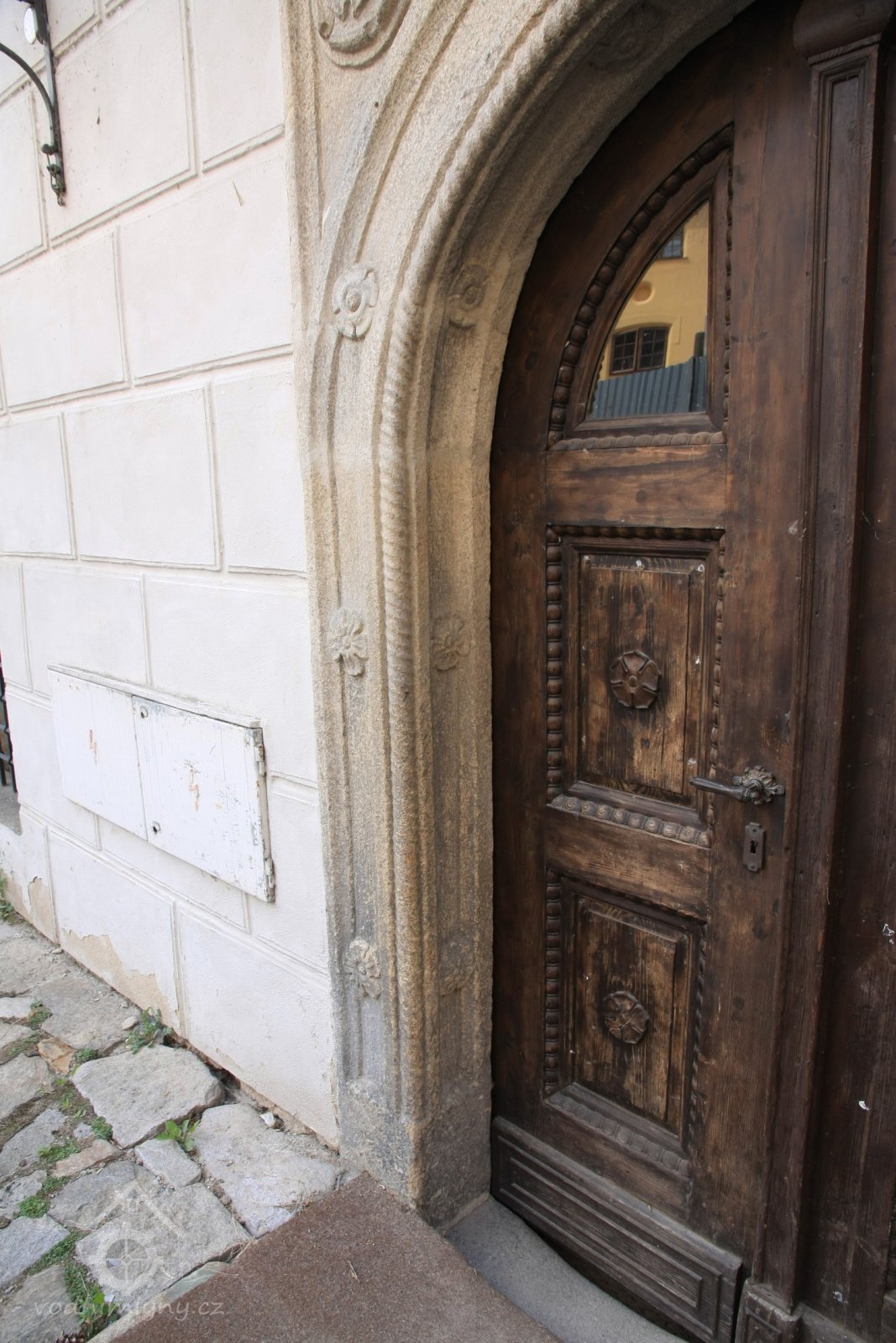 Mlýn o čtrnácti složeních. V průčelí kamenné obložení. Vnitřní obložení ozdobeno pětilistými růžemi ve vyhloubeném žlábku. Stejně profilovaná vrata i vně, ale na hraně se šroubovitým prutem. Nad obložením vodorovná římsa, pod níž v rozích po stranách archivolty hradecká a rožmberská růže. Nad římsou jsou žulové desky, na nichž pod římsou vytesané znaky Jáchyma a Anny z Rožmberka.