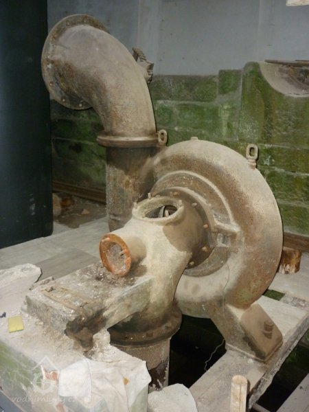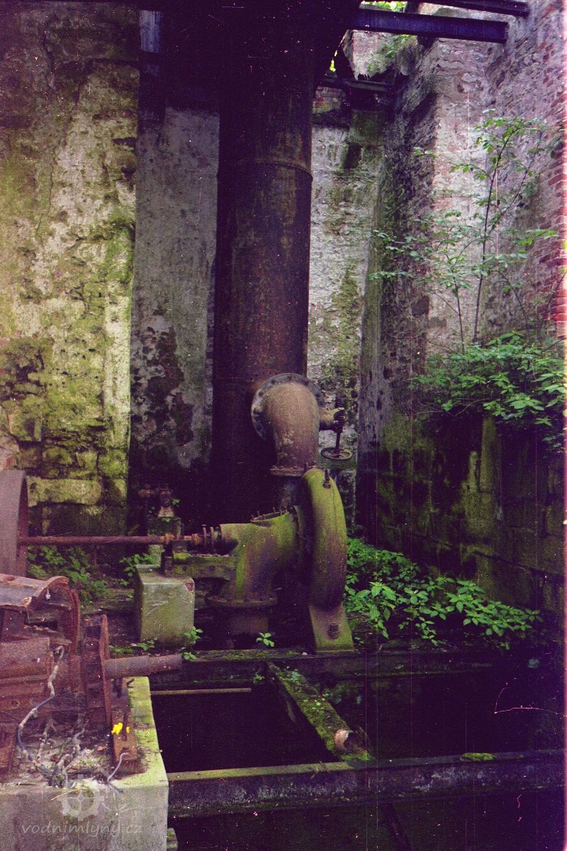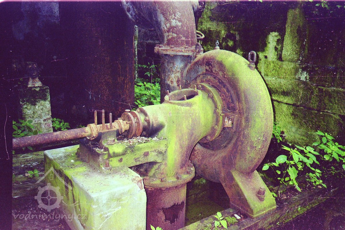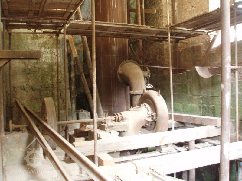 Popis Francisova turbína, která nahradila v roce 1923 vodní kolo, je nyní ve velmi špatném stavu.