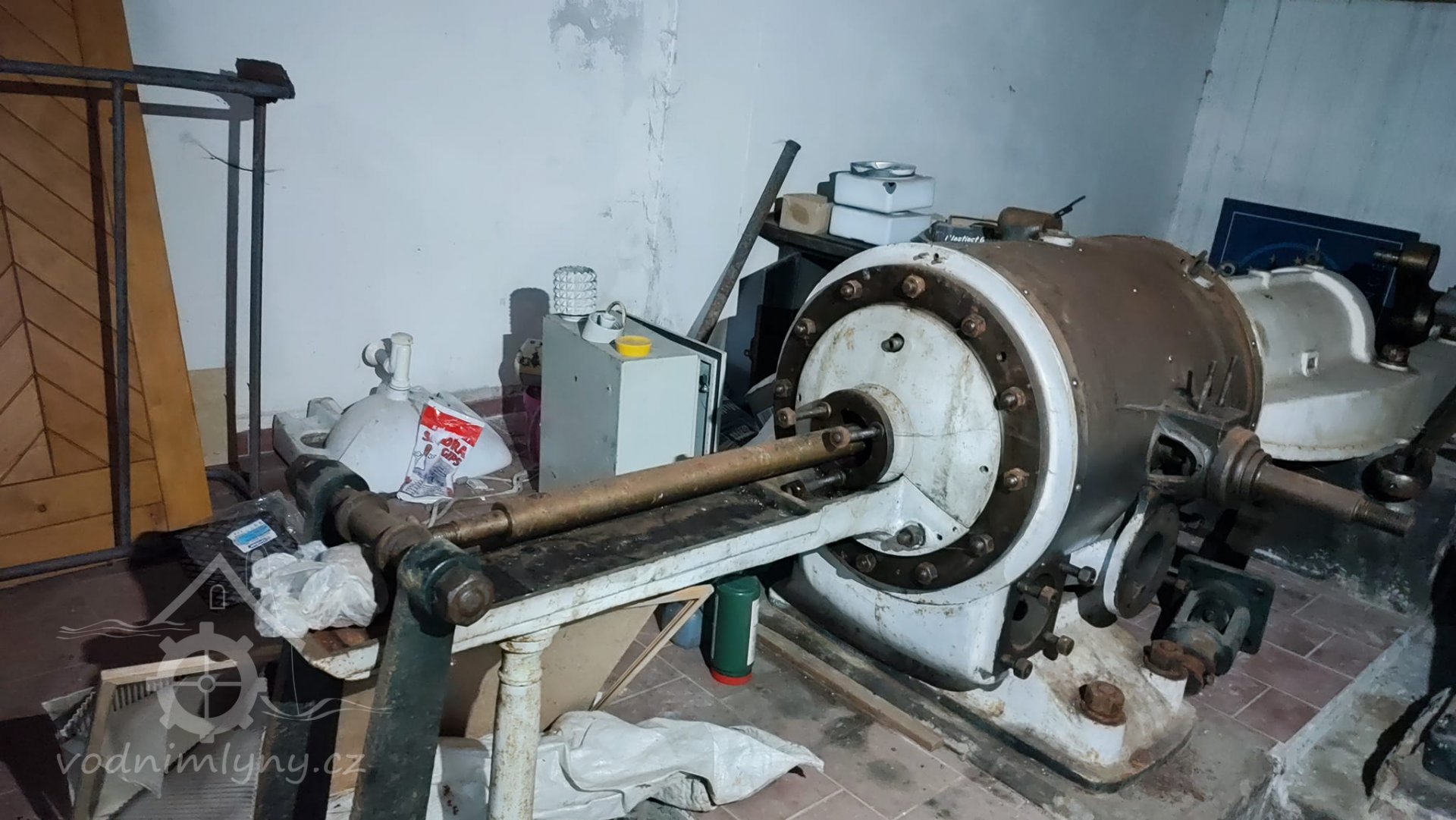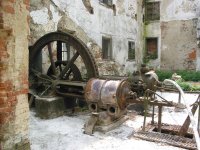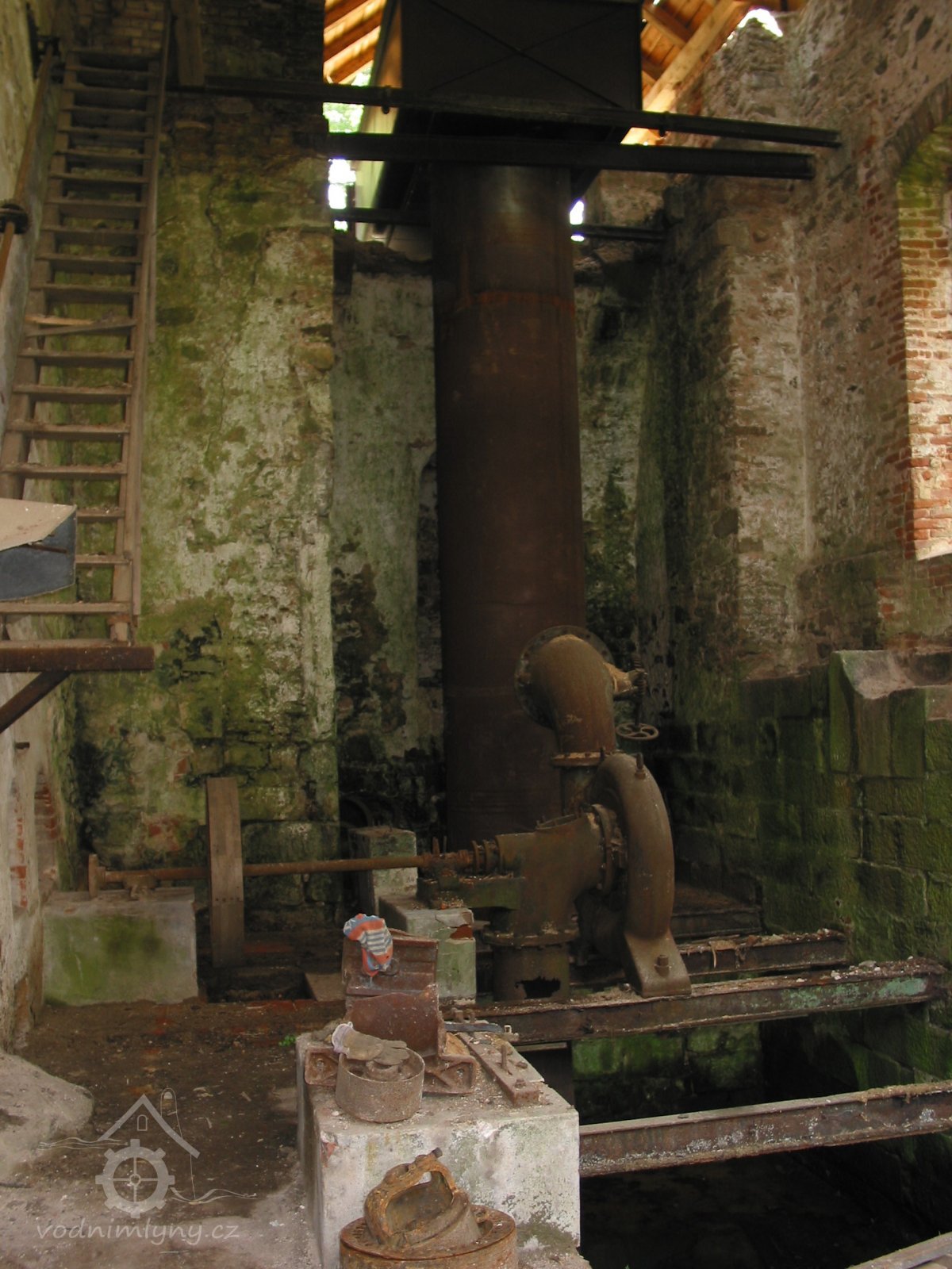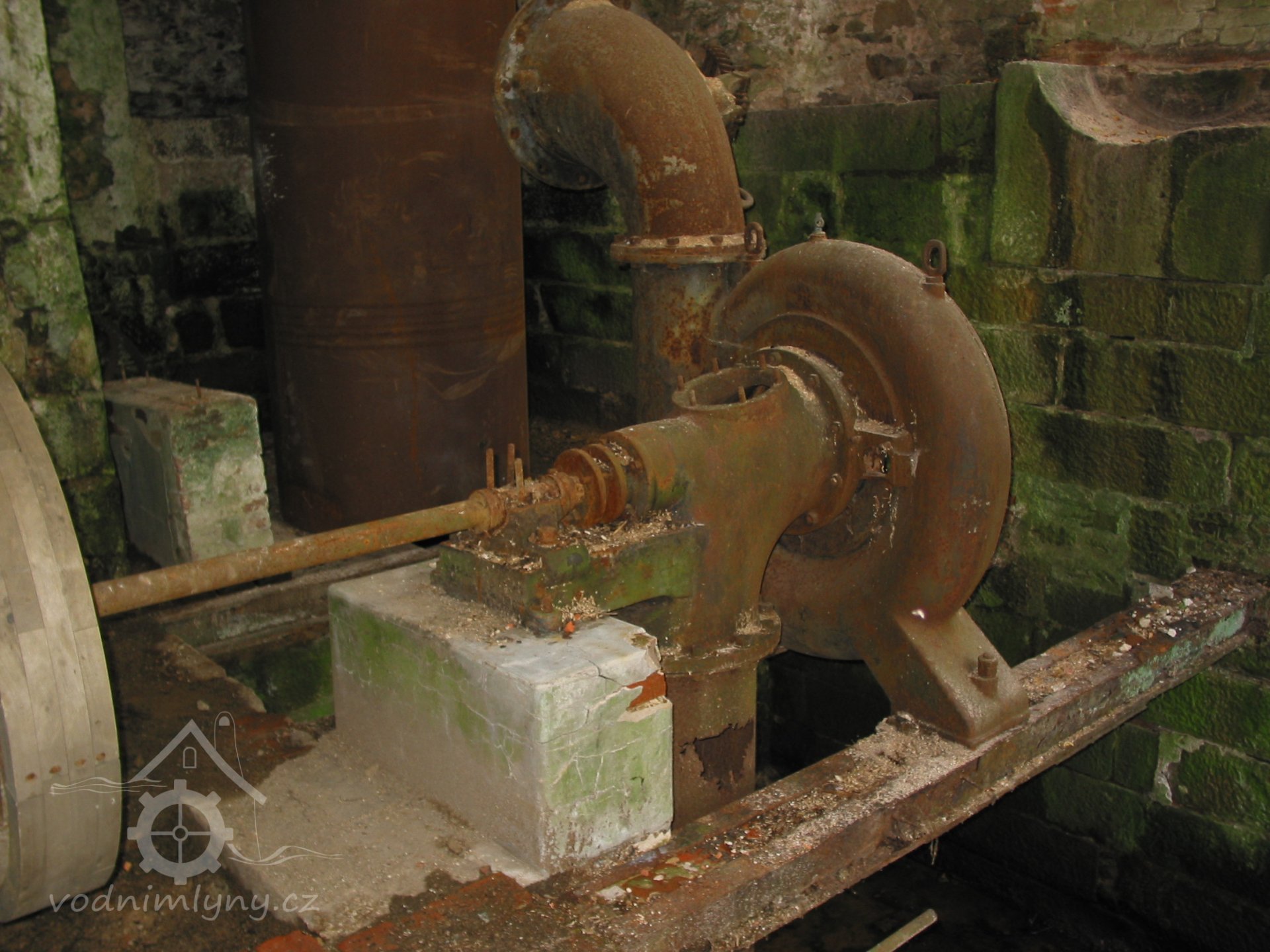 Popis Francisova turbína, která nahradila v roce 1923 vodní kolo, je nyní ve velmi špatném stavu.