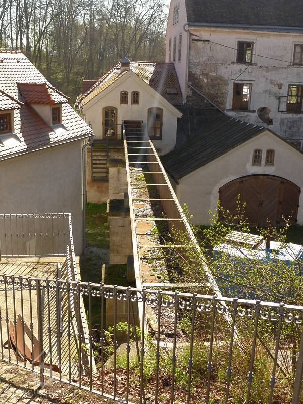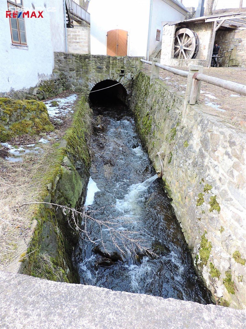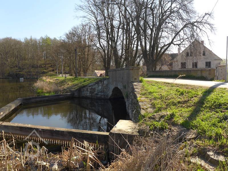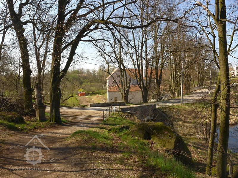 V návaznosti na chráněný mlýn jsou velmi zajímavá dvě přepadová koryta, vytesaná do rostlé skály, lomovým kamenem. Rovněž odpadový kanál je budován stejným způsobem. Při projekci podniku bylo iniciativně využito konfigurace terénu a možnost úpravy žulových skal. Před mlýnem je mohutná stavěná hráz, jejíž pevnost je zesilována kořeny starých lip, jichž je zde deset. Na kraji hráze byl plot, jehož tesané žulové sloupy jsou dnes dobře zachovány. Voda do turbíny je přiváděna potrubím v hrázi, které ústí do otevřeného koryta "vantrok" o čtyřhranném profilu, vedoucího nad úrovní terénu na ocelových sloupech. Koryto je v tomto stavu od roku 1888 (bylo jen opravováno a udržováno). Na obou koncích hráze rybníka před mlýnem jsou klenuté mosty, pod nimiž prochází koryto obou výše zmíněných přepadů.
