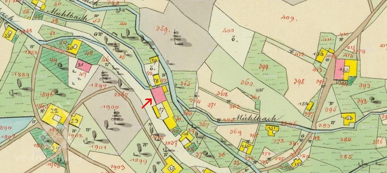 Původní č. p. popisné mlýna a pily bylo 1. V r. 1930 jej vlastnil A. Podhajský.