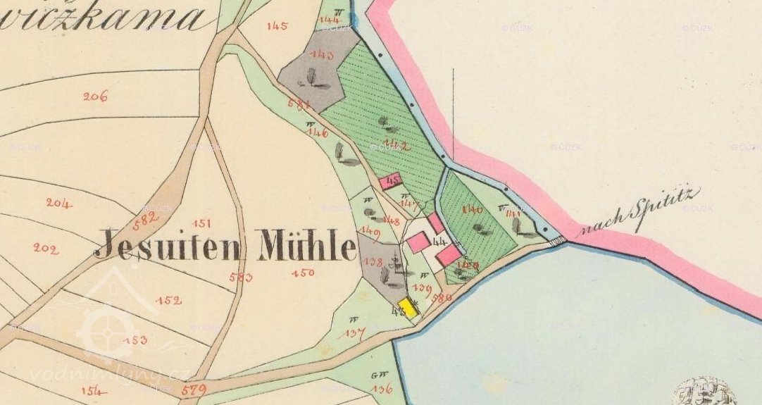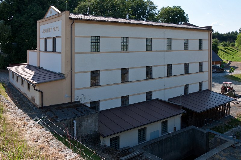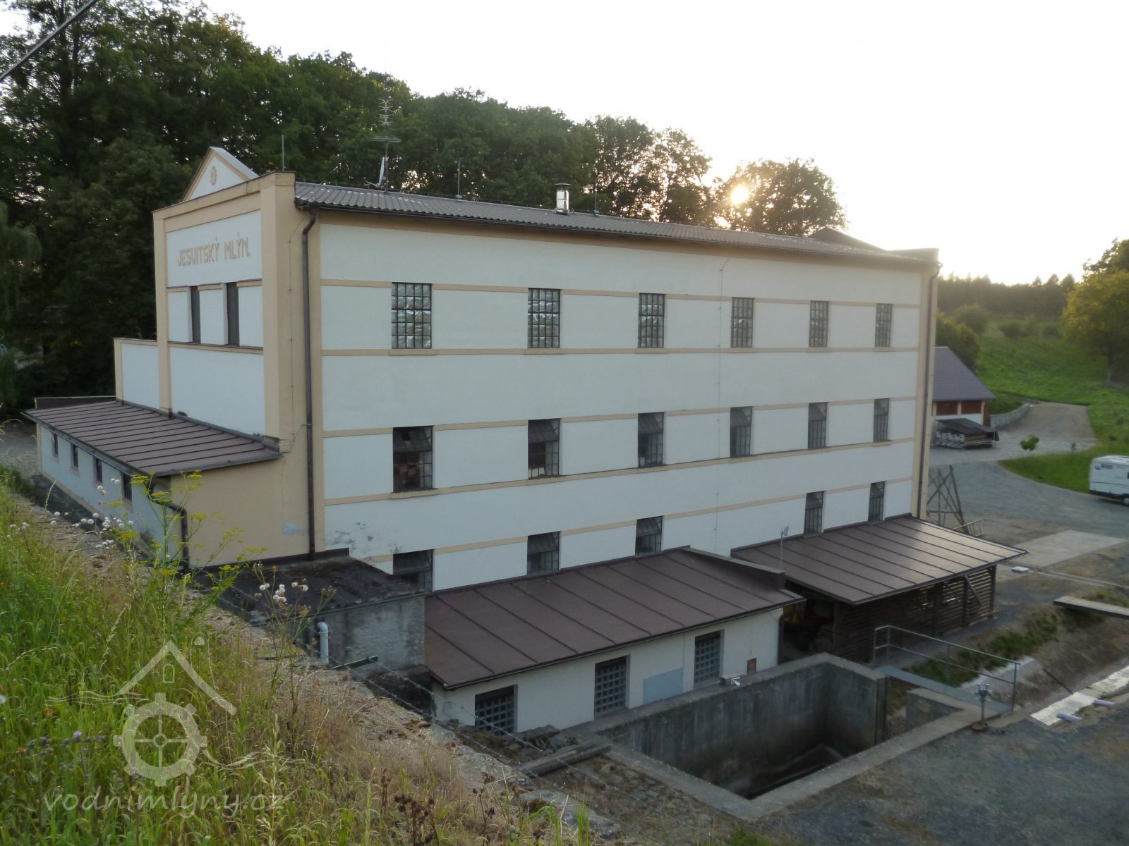 V polovině 17. století dal majitel panství generál Martin Maxmilián Goltz (†1653) postavit pro jezuity v Jeníkově rezidenci , kde řád působil do svého zrušení roku 1773. Jezuité založili tři kilometry severovýchodně od města na potoce Hostačovka rybník, který zaujímá plochu 13,6 hektaru a pod hrází postavili mlýn, jenž ještě ve starší podobě zachycuje císařský otisk stabilního katastru z roku 1838. V druhé polovině 19. století patřil rodině Machalických, krátce spadal pod velkostatek v Hostačově, ale ve třicátých letech byl rodině vrácen. Počátkem 20. století byl přebudován do dnešní podoby. K roku 1930 zde byla v provozu Francisova turbína 20 HP. Dnes je třípatrový mlýn opravený, má novou omítku s plastickými pásy a mlýnským znakem ve štítě. Je zde v provozu malá vodní elektrárna 26 kW a rybí sádka.