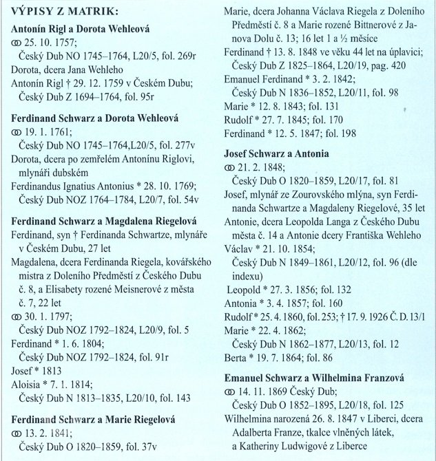 Dalším v pořadí byl Ferdinand Horn, který měl mlýn nejprve v nájmu v roce 1735 a vrchnosti platil 31 zlatých. 15. července 1737 mlýn od vrchnosti, kláštera sv. Jakuba ve Vídni, koupil za 1000 kop. V roce 1753 ho prodal za 1200 zlatých bývalému městskému písaři Janovi Wehlemu. Jeho dcera Dorota se v říjnu 1757 provdala za Antonína Rigla, syna zemřelého podvicmanského mlynáře Karla Rigla, který se tímto přiženil na mlýn v Českém Dubu. Antonín však zemřel již v prosinci 1759 ve věku 27 let. Vdova po Antonínu Dorota se znovu provdala, a to v roce 1761 za Ferdinanda Schwarze. Rod Schwarzů pak vlastnil mlýn od roku 1761 až do začátku 20. st. V roce 1796 převzal živnost od otce za 8000 zlatých Ferdinand Schwarz mladší, narozený v roce 1769. Oženil se s Magdalenou Riegelovou, dcerou kovářského mistra z Dolního Předměstí. Jejich syn Ferdinand, budoucí mlynář, se narodil 1. 6. 1804. Kromě něj měli ještě syna Josefa (1813) a dceru Aloisii (1814). Třetí Ferdinand Schwarz se ujal mlýna v roce 1835, zaplatil za něj 8000 zlatých. V únoru 1841 se oženil s Marií Riegelovou, dcerou Johanna Václava Riegela z Dolního Předměstí. V letech 1842 až 1847 se jim narodily 4 děti, Emanuel Ferdinand (1842), Marie (1843), Rudolf (1845) a Ferdinand (1847). Mlynář zemřel 13. 8. 1848 ve 44 letech na úplavici. (MH)
