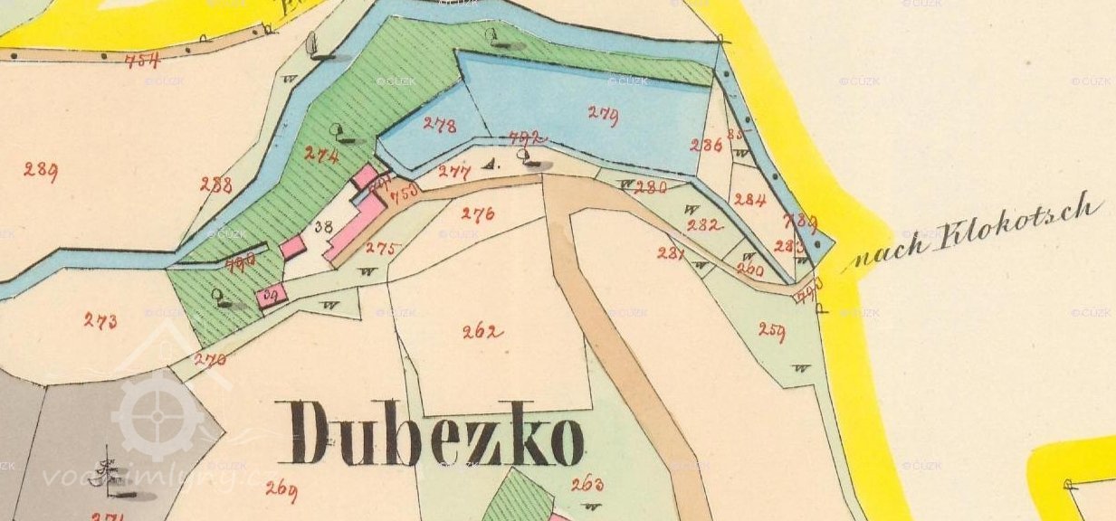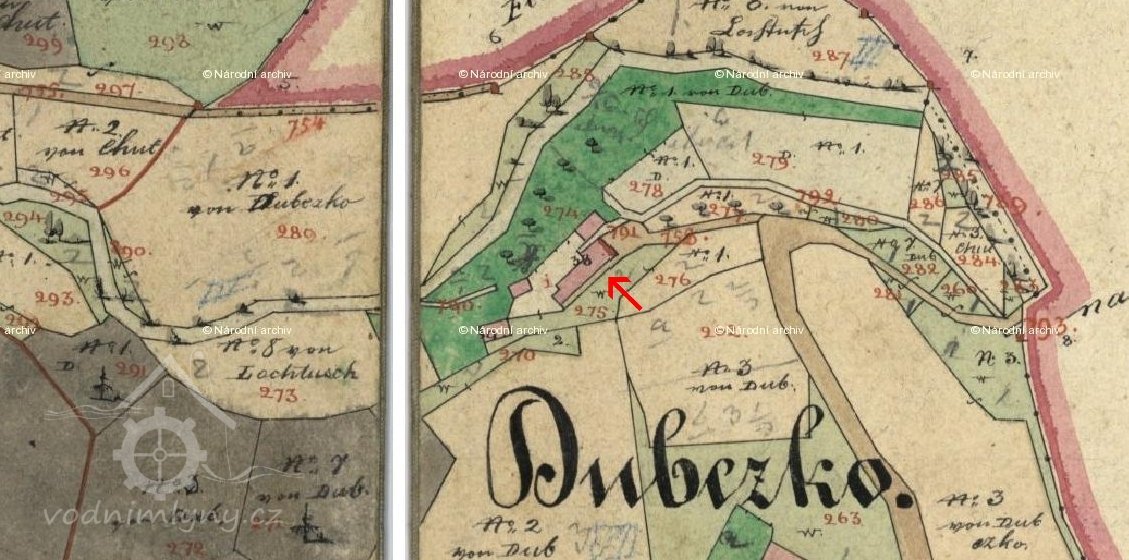 Vody z potoka od Kozákova přicházejícího a sesíleného v Lochtuši potůčkem tekoucím od Vesce bylo od zřízení mlýna toho od majitelů mlýna v Dubecku čp. 1 dle poměrů nyní zjištěného užíváno. Majitelé mlýna vždy dle potřeby mlýnský náhon a strouhy čistívali a hlínu na sousední břehy bez odporu sousedů vyhazovali s možným šetřením pozemků sousedních. Vydržování, náhonu, splavu i vantrok přísluší majiteli mlýna.