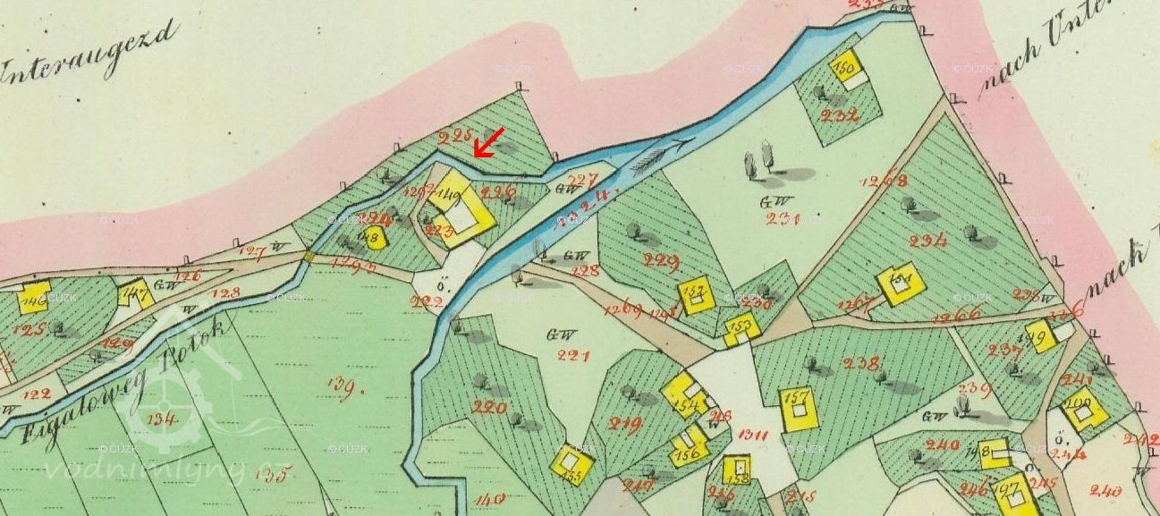 PopisV roce 1930 mlýn pohání kolo na svrchní vodu s průtokem 0.057 m3/s, spádem 5.2 m o výkonu 5 k.