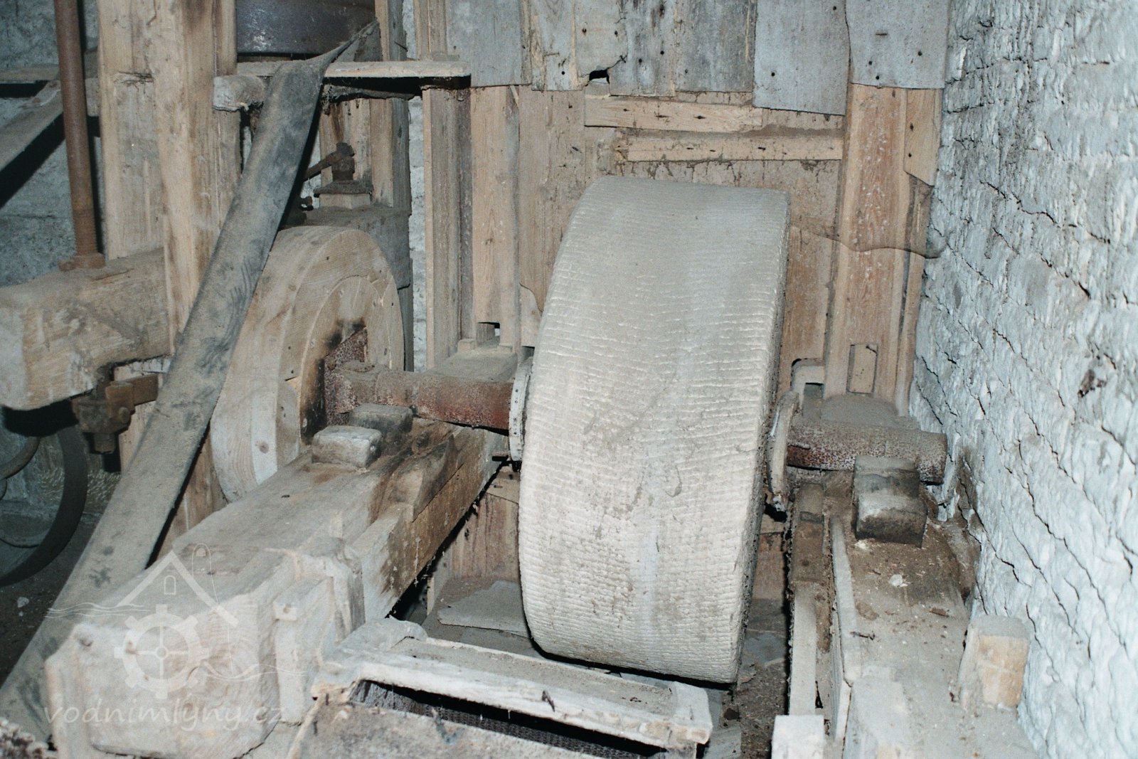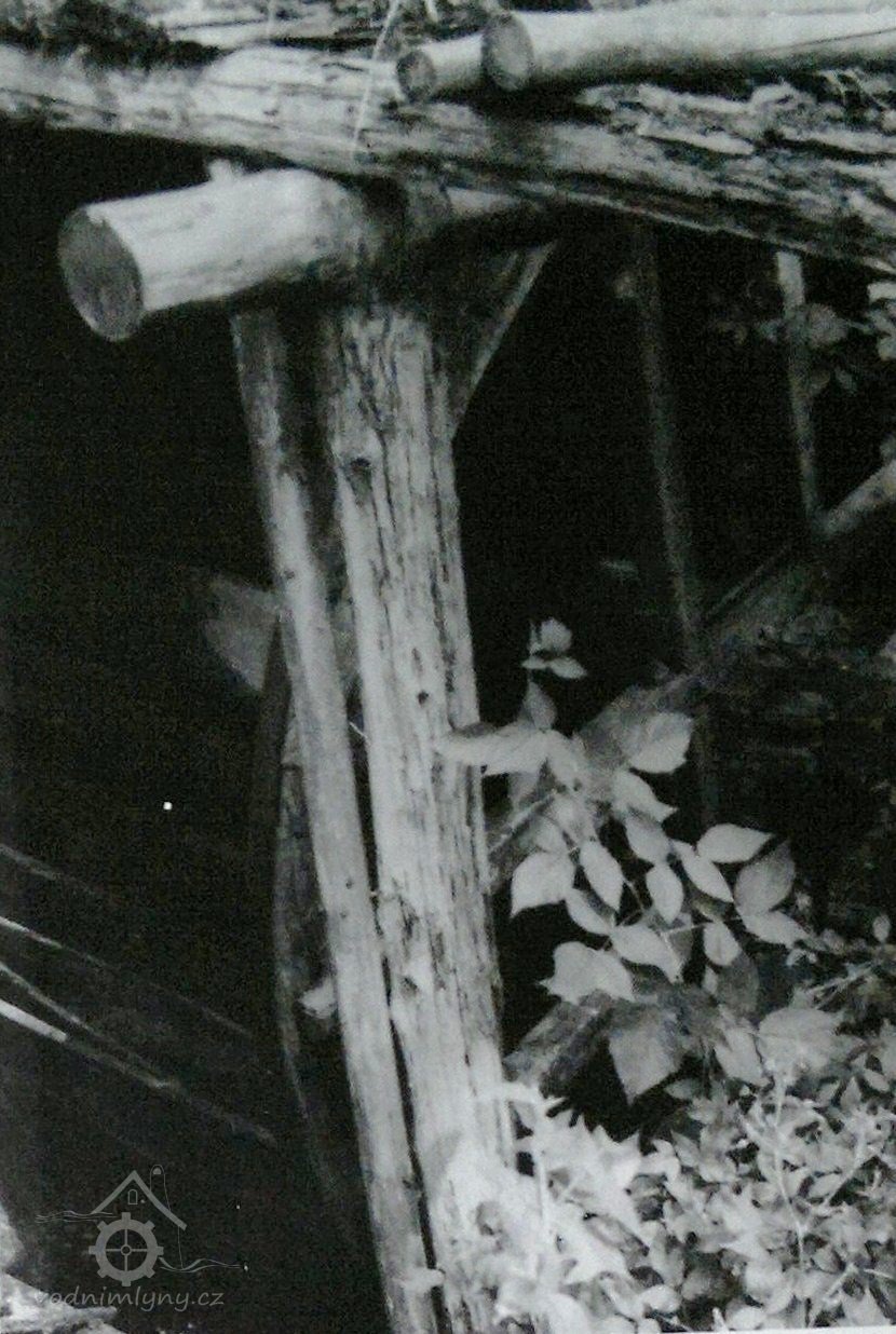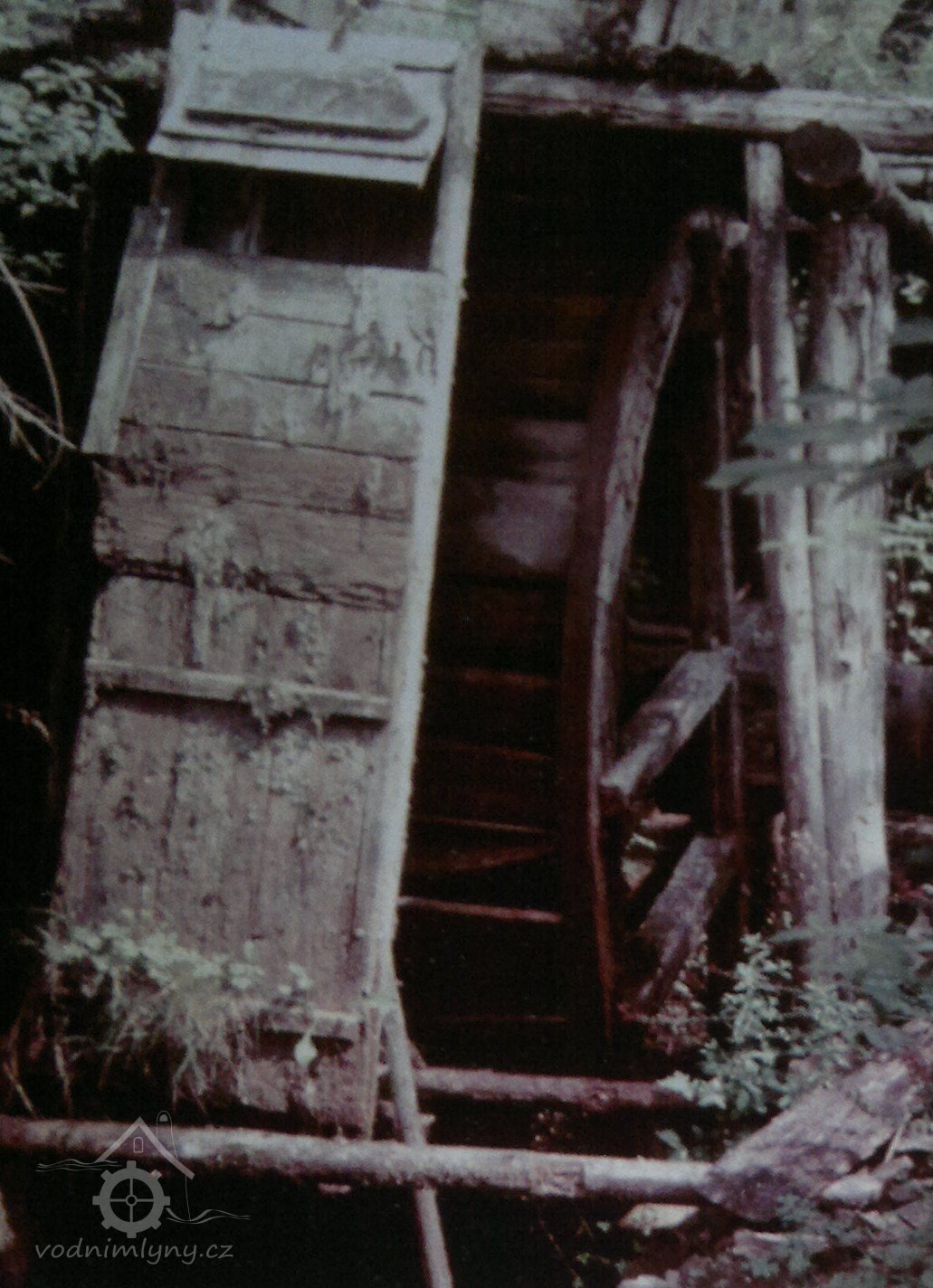 Celedřevěné vodní kolo o Ø 3,85, šířky 1,20 metru. Venkovní část čepu hřídele se otáčela v kamenném ložisku. Existence vodního kola ještě v 70. letech (Dnes pouze hřídel).
