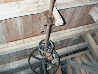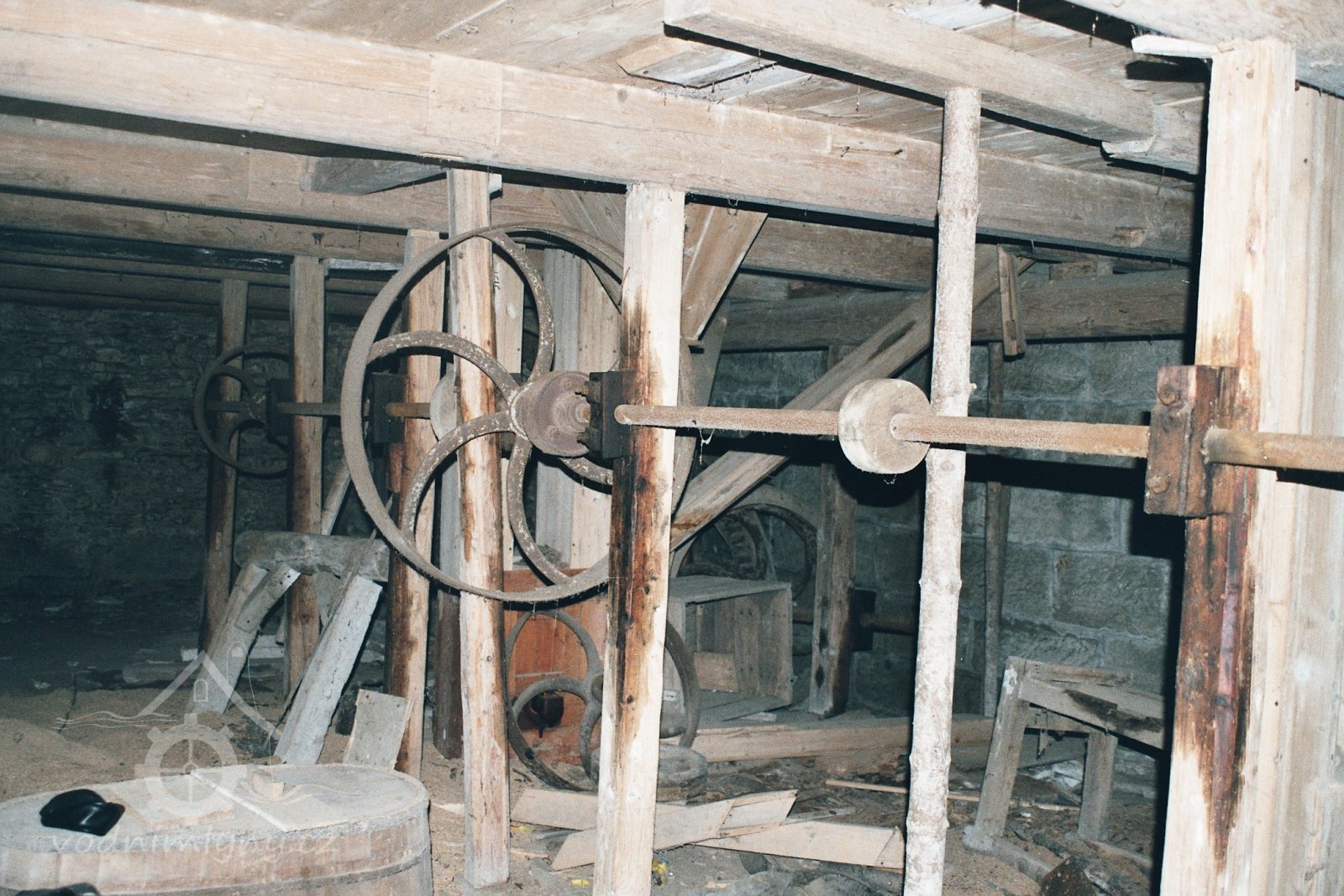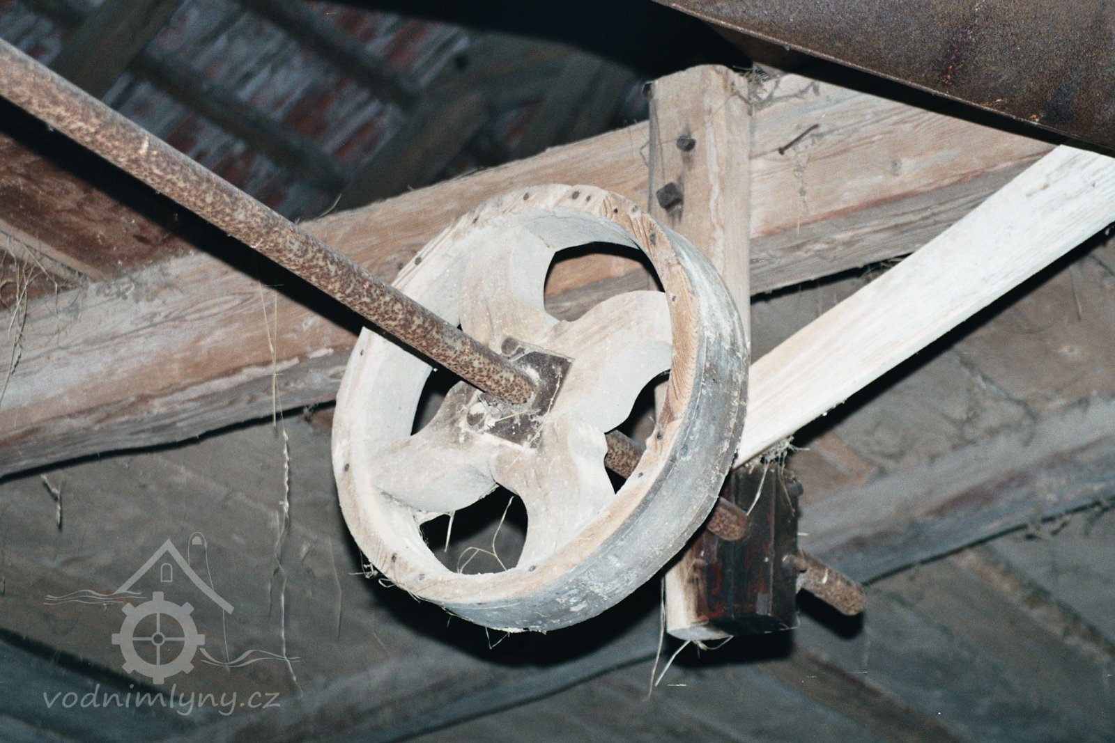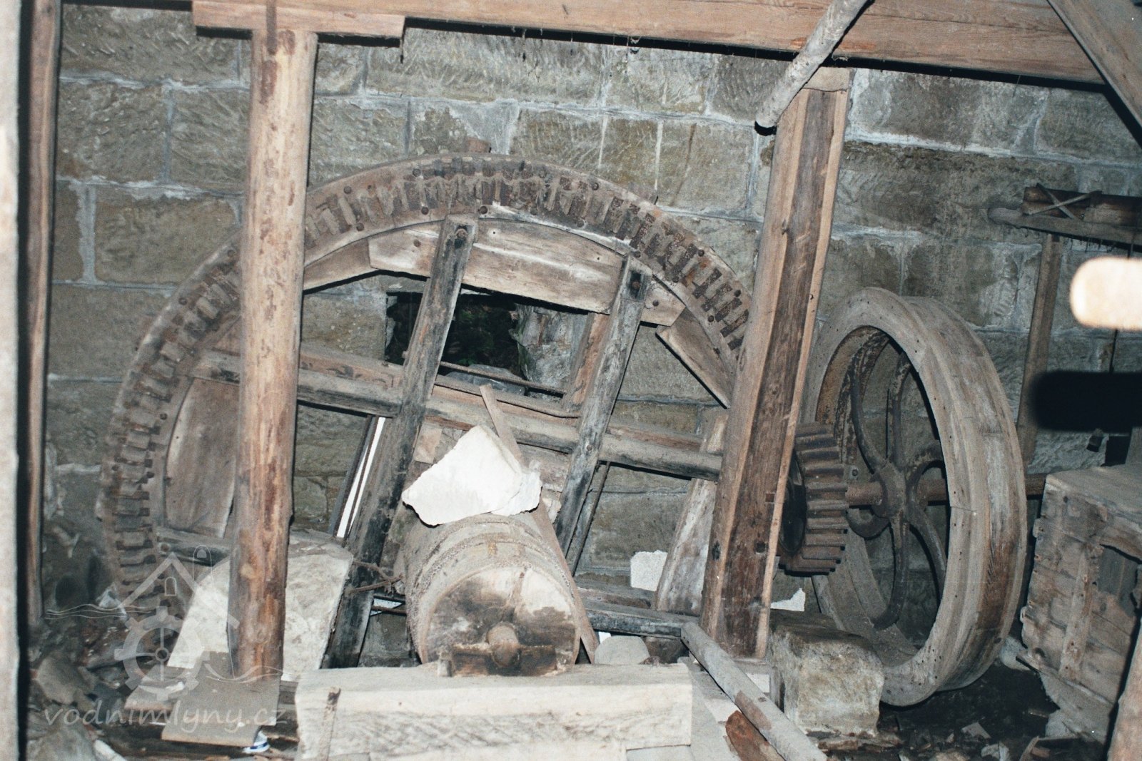 Celedřevěné vodní kolo o Ø 3,85, šířky 1,20 metru. Venkovní část čepu hřídele se otáčela v kamenném ložisku. Existence vodního kola ještě v 70. letech (Dnes pouze hřídel).