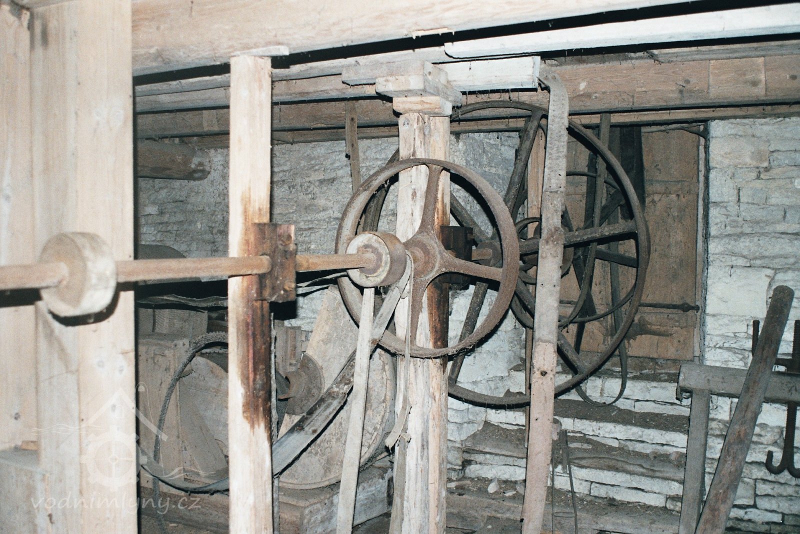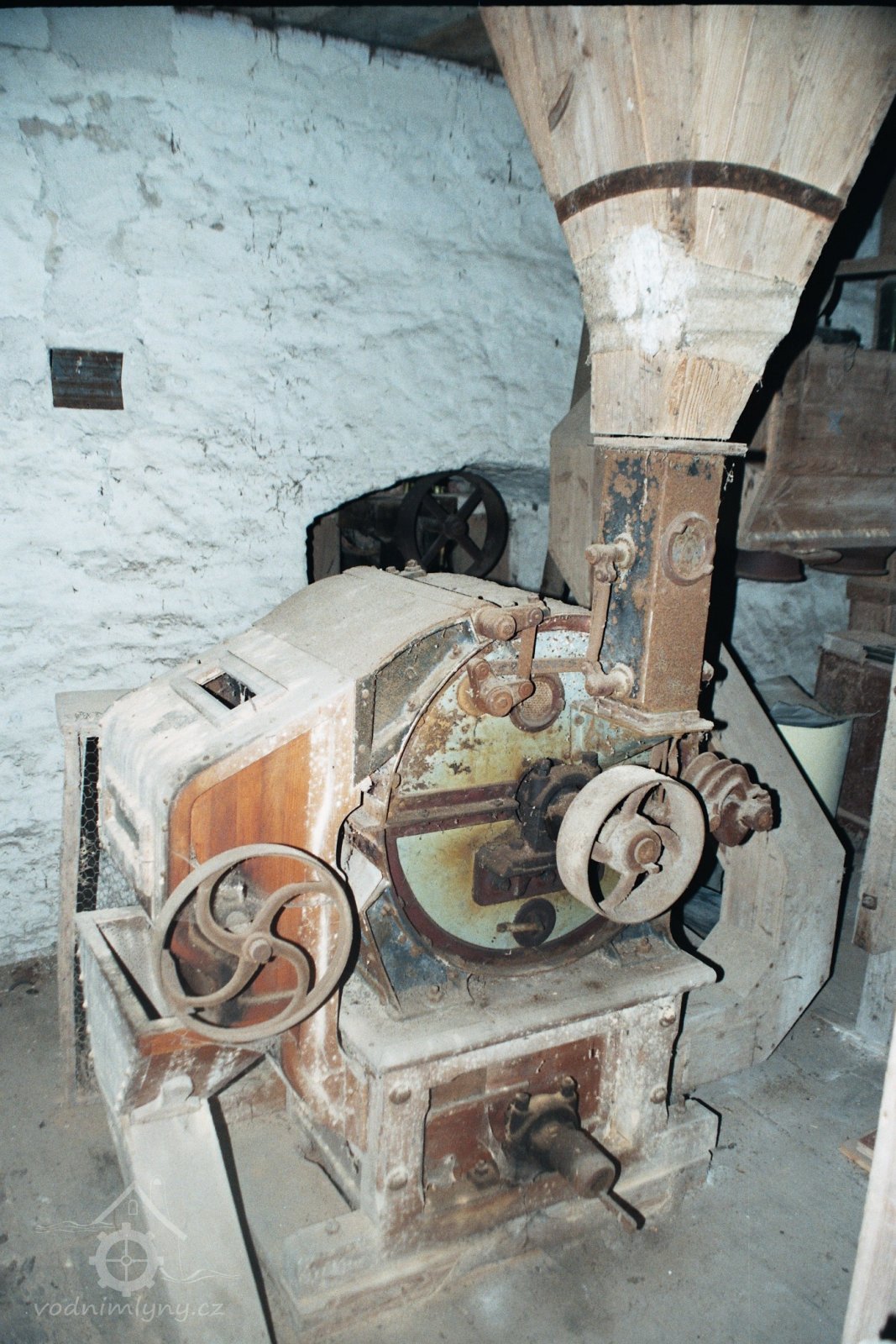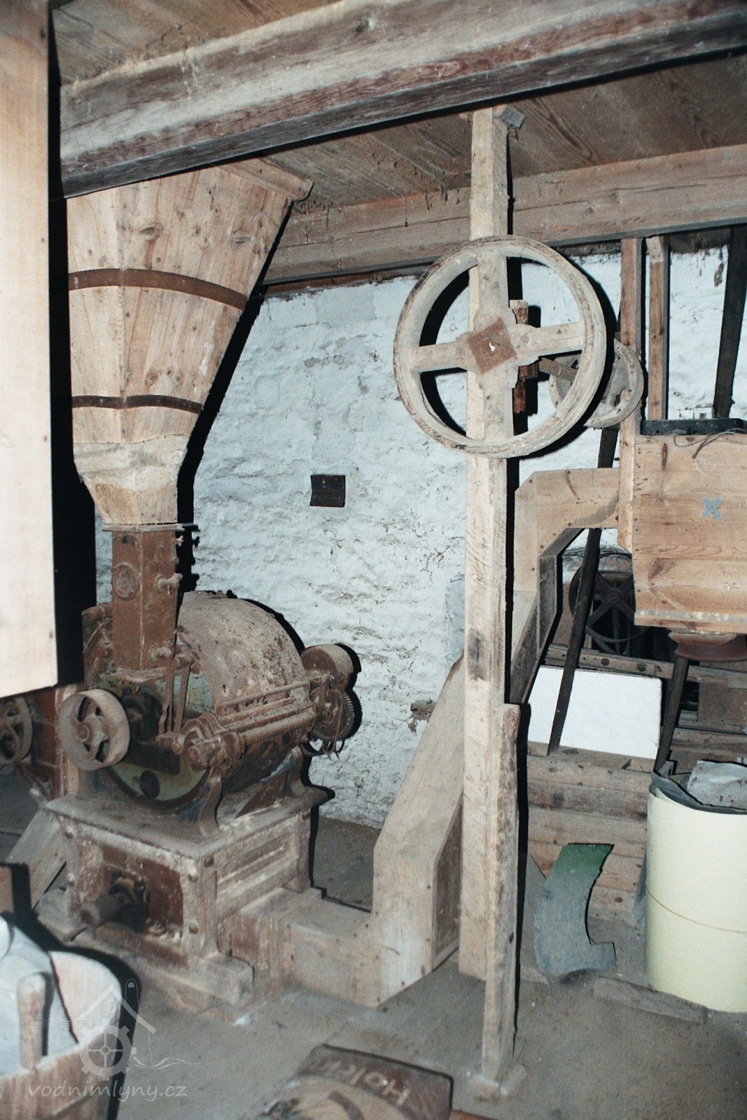 Dřevěná hřídel od vodního kola prochází do podkolí hřídelovým otvorem, kde přes dřevěné paleční kolo velmi neobvyklé konstrukce roztáčela litinový pastorek na hřídeli s velkou řemenicí. Mlynář potřeboval zvýšit obvodovou rychlost a tak na řemenici zhotovil dřevěný kruhový nástavec, aby tak zajistil vyšší otáčky hlavní hnací transmise, jenž je usazena v ložiskách na dřevěných sloupcích. V podkolí se také nachází (neobvyklé) čistící soustava na zrní, složená z hranolového vysévače a koukolníku. Jsou zde i původní, elektrorozvodné desky a z části demontovaný krupník - holendr. Na prvním podlaží pak byla válcová stolice, původně staršího typu a později nová (demontována), měly zde být instalovány celkem 3 nové stolice Prokop - Pardubice, avšak k tomu už nikdy nedošlo v důsledku ukončení mlýnské činnosti v r. 1941. Je zde dochována loupačka periodická s filtrem, poháněná z transmise přes předlohu, kamenné mlecí složení a skříňový filtr. Na druhém podlaží: reforma typu J. Prokop - Pardubice z 30. let 20. stol. a u stropních trámů rozvodová transmise. V podstřeší je pak dochováno zajímavé odlučovací zařízení (spirokap/autokap), hlavy kapsových dopravníků, jenž prochází všemi patry a z části demontované hranolové vysévače.
