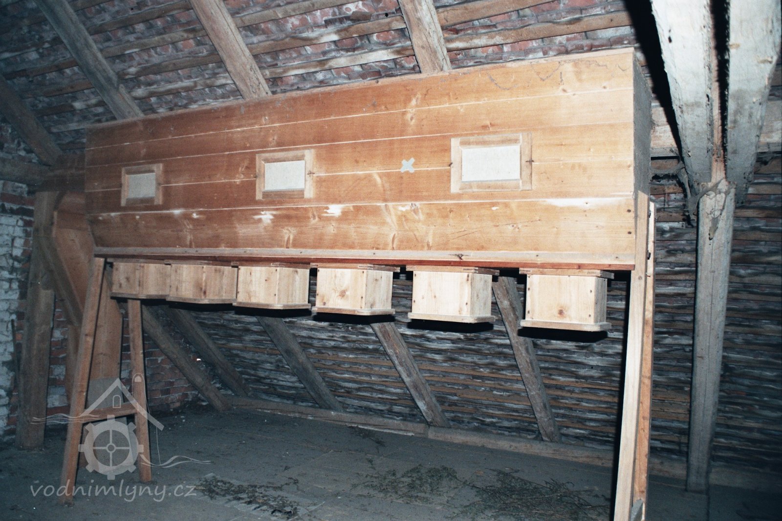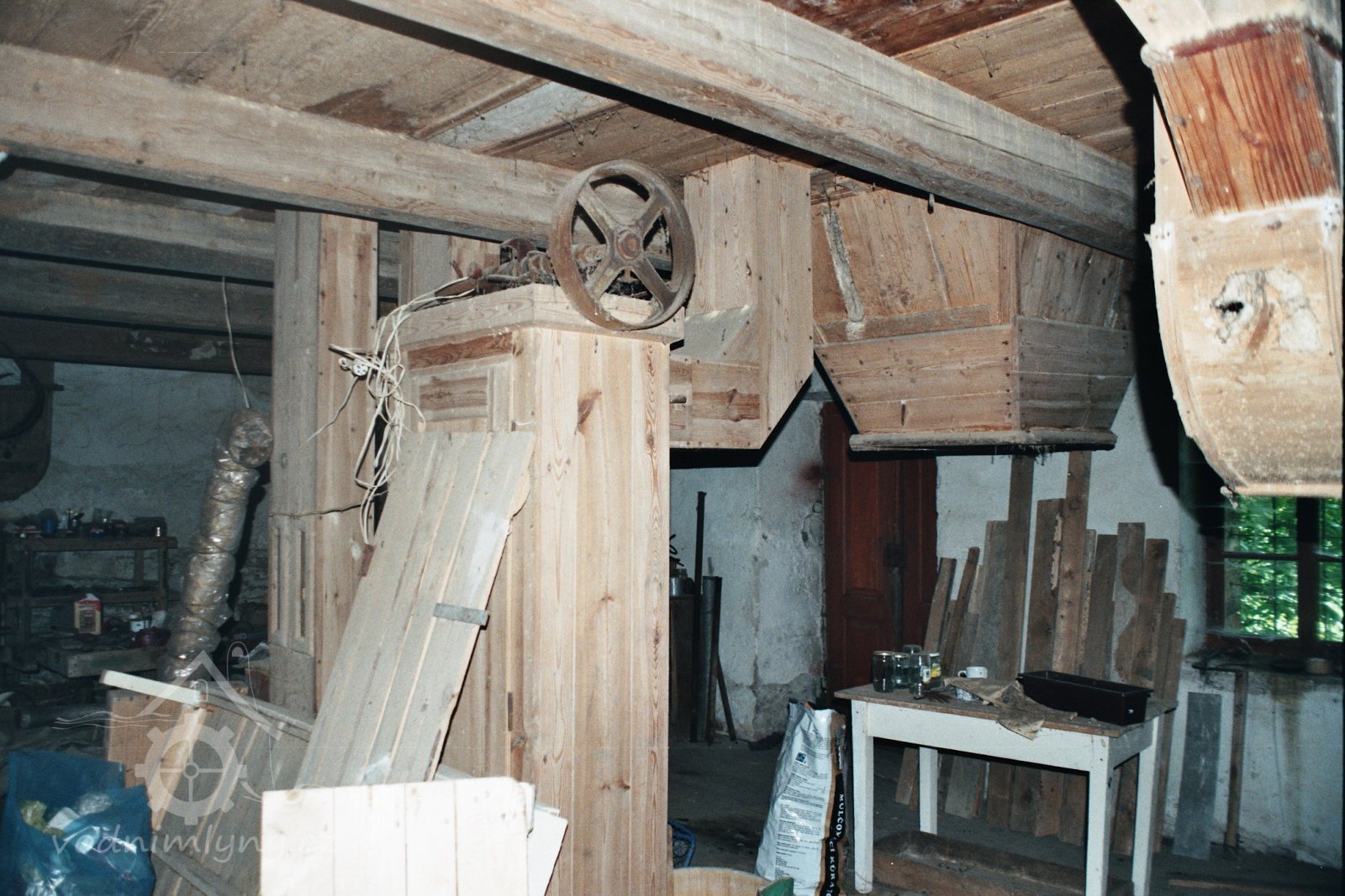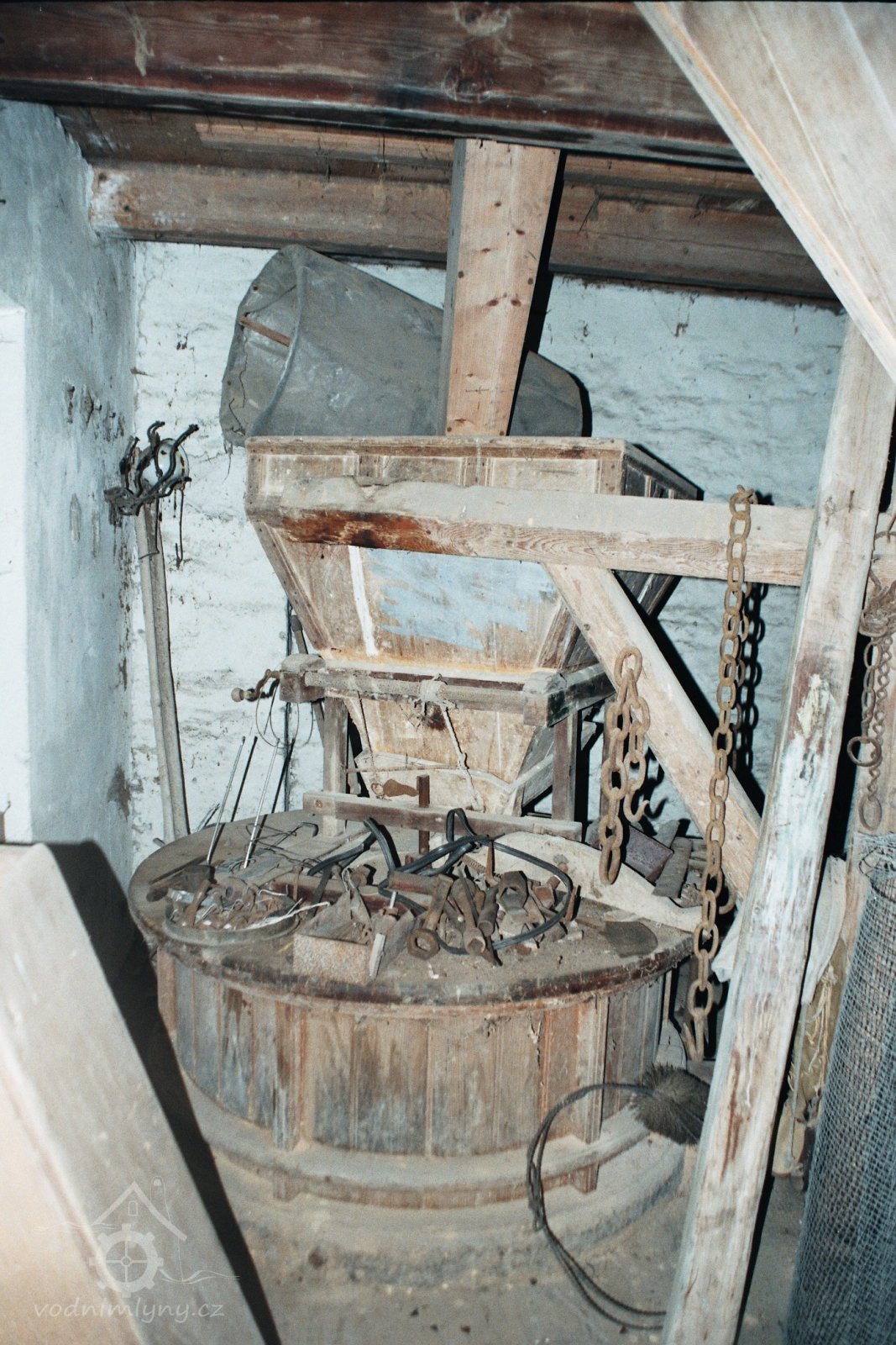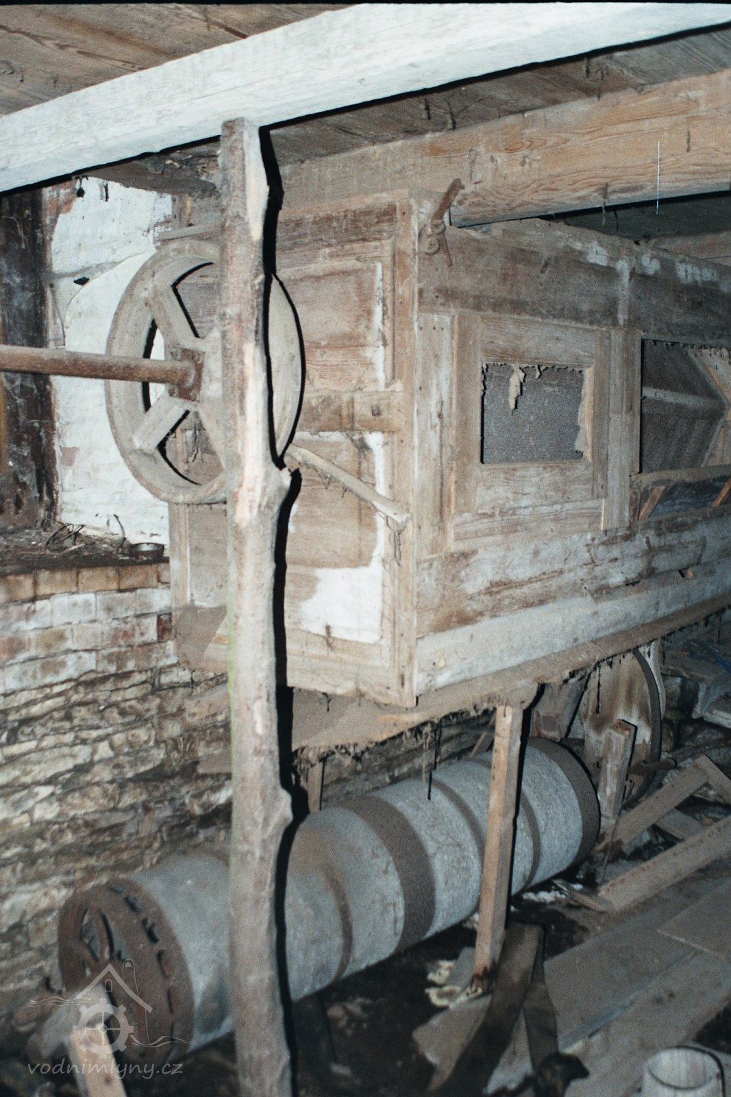 Dřevěná hřídel od vodního kola prochází do podkolí hřídelovým otvorem, kde přes dřevěné paleční kolo velmi neobvyklé konstrukce roztáčela litinový pastorek na hřídeli s velkou řemenicí. Mlynář potřeboval zvýšit obvodovou rychlost a tak na řemenici zhotovil dřevěný kruhový nástavec, aby tak zajistil vyšší otáčky hlavní hnací transmise, jenž je usazena v ložiskách na dřevěných sloupcích. V podkolí se také nachází (neobvyklé) čistící soustava na zrní, složená z hranolového vysévače a koukolníku. Jsou zde i původní, elektrorozvodné desky a z části demontovaný krupník - holendr. Na prvním podlaží pak byla válcová stolice, původně staršího typu a později nová (demontována), měly zde být instalovány celkem 3 nové stolice Prokop - Pardubice, avšak k tomu už nikdy nedošlo v důsledku ukončení mlýnské činnosti v r. 1941. Je zde dochována loupačka periodická s filtrem, poháněná z transmise přes předlohu, kamenné mlecí složení a skříňový filtr. Na druhém podlaží: reforma typu J. Prokop - Pardubice z 30. let 20. stol. a u stropních trámů rozvodová transmise. V podstřeší je pak dochováno zajímavé odlučovací zařízení (spirokap/autokap), hlavy kapsových dopravníků, jenž prochází všemi patry a z části demontované hranolové vysévače.