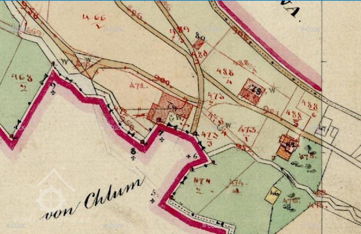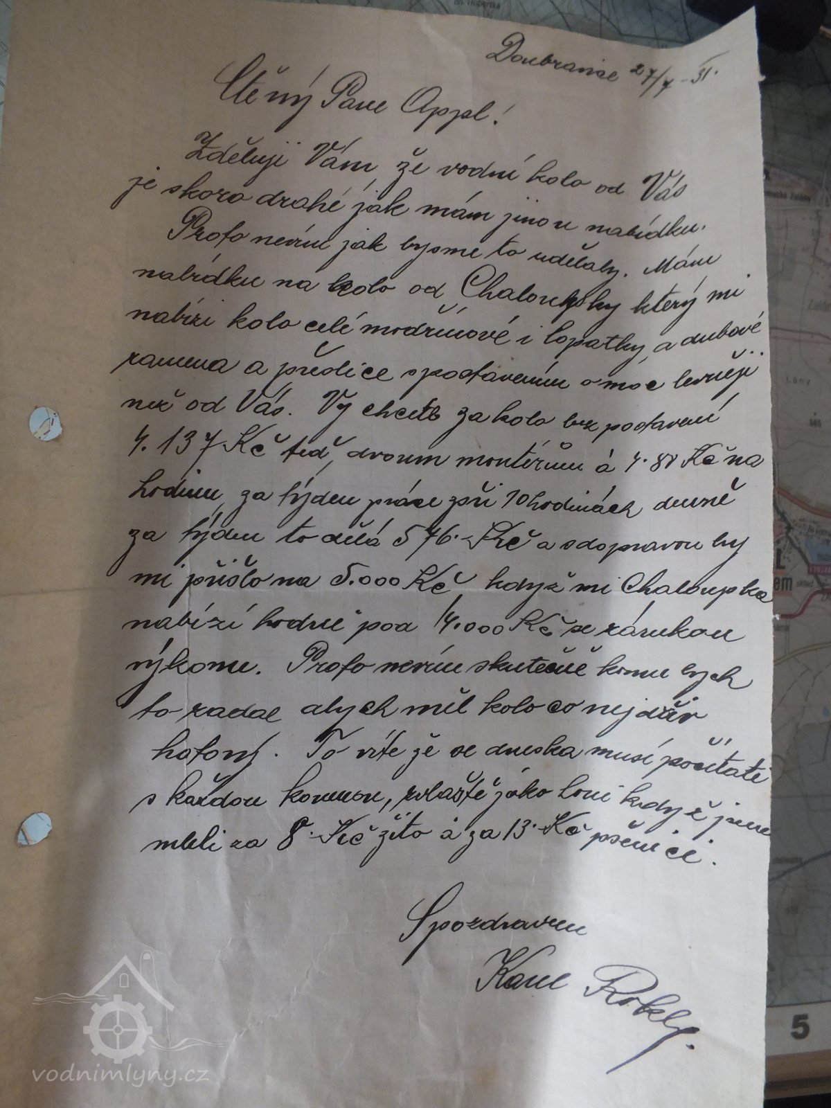 PopisBylo zde celodřevěné vodní kolo na vrchní vodu Ø 3,65 šíře 1,50 metru. Lopatky (korečky) hloubky 30 cm, výkon 9,5 HP.