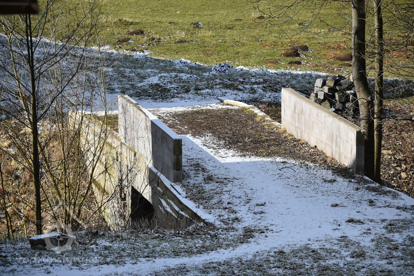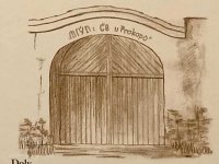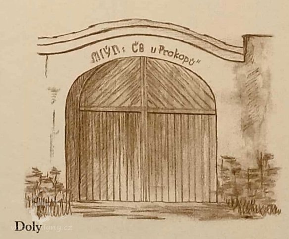 Klenutý vjezd s nápisem "Mlýn č. 8 u Prokopů", zbořen po r. 1969