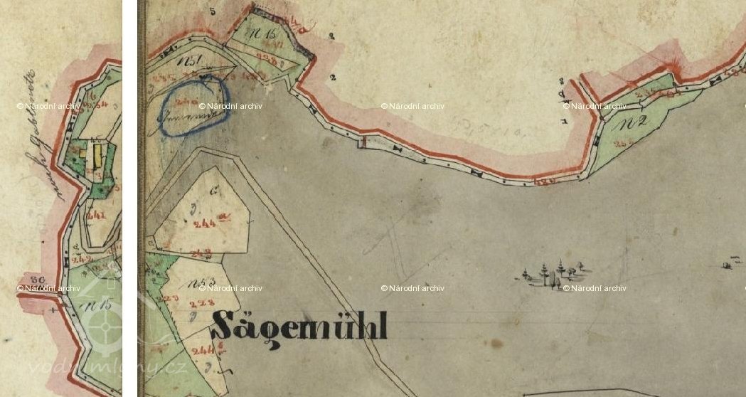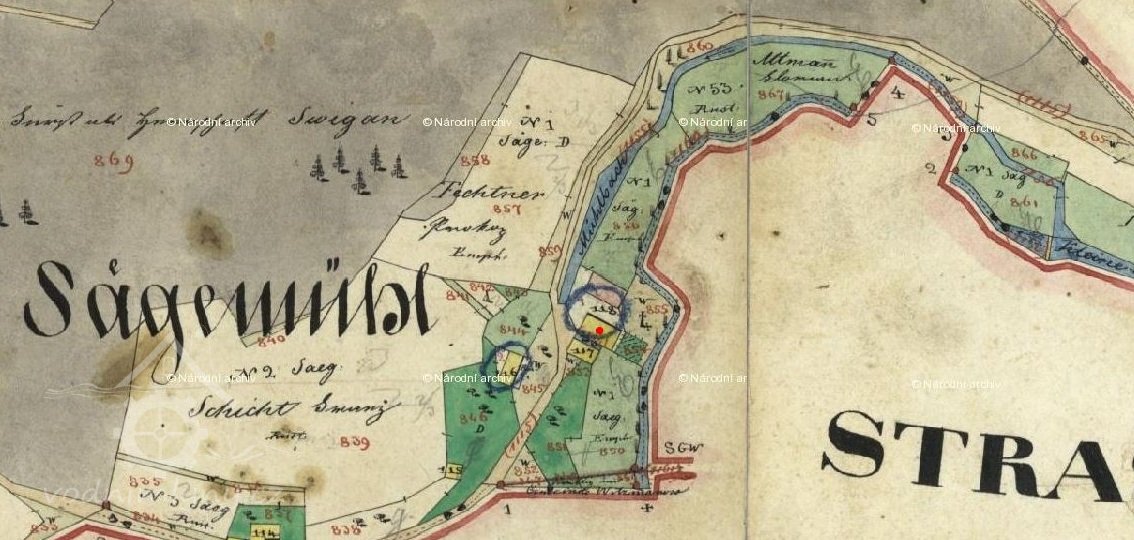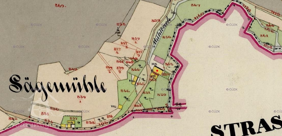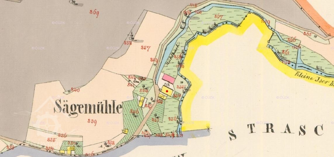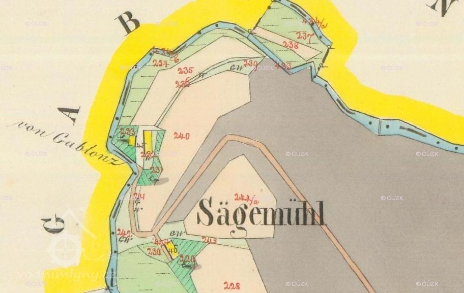 Popis1895: 2 kola pro mlýn a 1 pro pilu, všechna o průměru 4,36 m, šířka 94, 89, a 83 cm