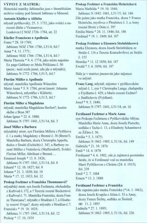 V pozemkové knize Jablonce u Mimoně (Jabloneček) je k roku 1615 zápis, že Jan Nyklů, mlynář pytlíkovský, koupil v sobotu po svatém Jiří chalupu od pozůstalé vdovy a sirotků po nebožtíku Janu Milhonsovi za 75 kop míšeňských. (MH)