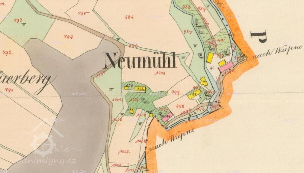 Nejstarším písemným dokladem o existenci zdejšího mlýna je opis urbáře, který vznikl okolo roku 1400 na půdě kláštera. V jeho soupise povinností pro obec Vápno je uveden mlýn, který platil klášteru po 16 groších o sv. Jiří a o sv. Havlu. V době husitských válek byl klášter zrušen a neexistují ani další informace o mlýnu. (MH)