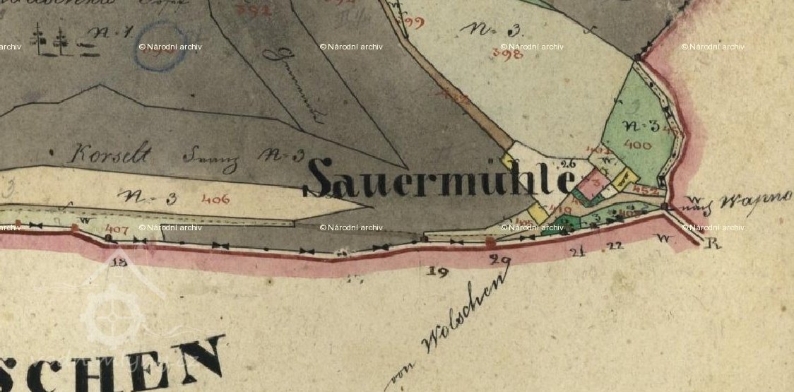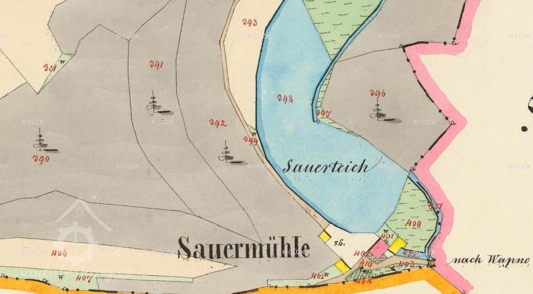 Mlýn je připomínán již v Tereziánském katastru z roku 1715. Zakladatelem mlýna byl údajně jakýsi Sauer, od kterého je odvozováno jméno mlýna. Z dalších majitelů je k letem 1788 a 1843 jmenován Franz Korselt, 1877 Ferdinand Schwarz a od roku 1890 Josef Weiser, jehož potomci drželi mlýn a pilu až do roku 1957.