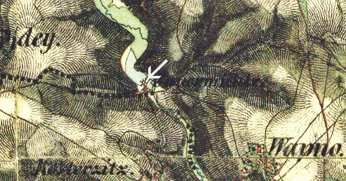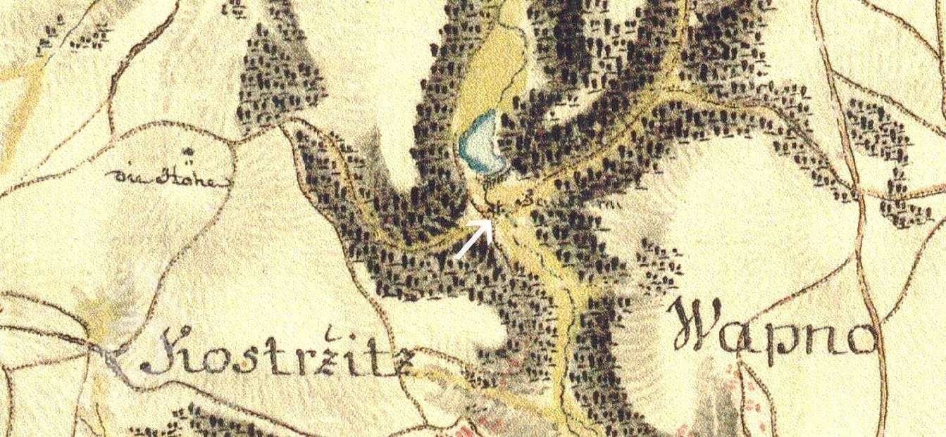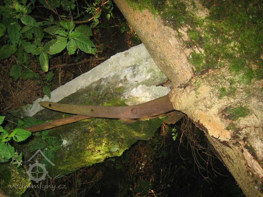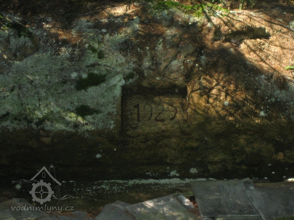Pevný bod byl na skalní stěně 2 m vzdálený od levého sloupu stavidel. Je tvořen vodorovnou rýhou se dvěma na hrot postavenými trojúhelníky. Další pomocný fixní bod pro měření vpouštěcích stavidel byl vyznačen vodorovnou 0,5 m dlouhou čarou na mlýnské budově umístěnou ve výšce 1 m nad horní hranou stavidla.(MH)
