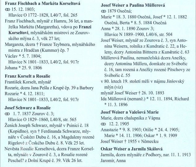 Franz Korselt mladší je na Zourovském mlýně uváděn jako mlynář v roce 1811. Tehdy se mu a jeho manželce Rosalii, rozené Pešlové z Krupé, narodila dcera Rozalie, která se v 1. 7. 1837 provdala za Josefa Schwartze, syna českodubského mlynáře Ferdinanda Schwartze z čp. 16, který v té době pracoval jako mlynář na mlýně v Psinici čp. 18. Rozalie Schwartzová zemřela 13. ledna 1847. (MH)