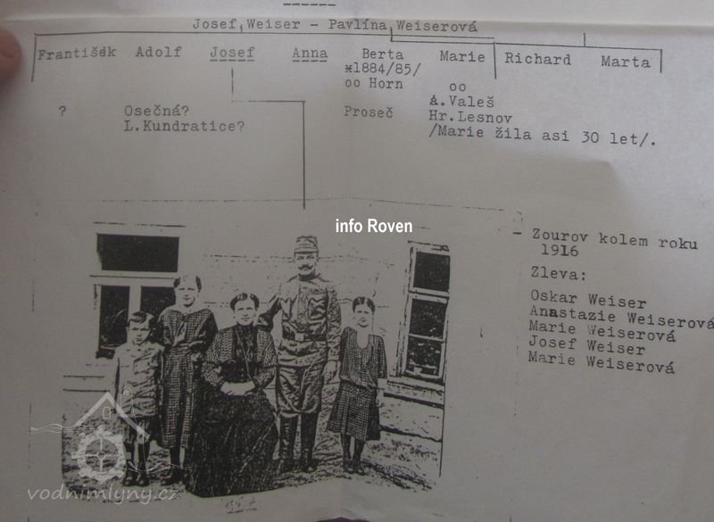 Josef Weiser mladší, narozený 1882 na Jenišovském mlýně v Osečné, se v roce 1905 oženil s Marií Valešovou z Vápna. Postupně se jim v Zourově narodily 4 děti, dcery Anastazie, Otilie a Marie, a v roce 1909 budoucí mlynář syn Oskar. Od roku 1906 sloužila k pohonu pily nová Francisova turbína o hltnosti 162 litrů za sekundu. Kolaudace se uskutečnila 7. Ledna 1906. V roce 1910 nechal mlynář pro pohon mlýna nainstalovat Francisovu spirálovou turbínu. Při spádu 4 m, hltnosti 180 listrů na sekundu a 345 otáčkách za minutu dávala výkon 9 HP. Kolaudace proběhla 14. srpna 1912, povolení k užívání vydaly úřady 17. srpna 1912. Stavbou druhé turbíny mlynář překročil povolenou hranici pro odběr vody ze Zábrdky. Podle úřadů směl odebírat 260 litrů za vteřinu. Obě turbíny by ale při plném výkonu teoreticky spotřebovaly 342 litrů. Nedostatečné množství vody vylepšoval rybník. (MH)