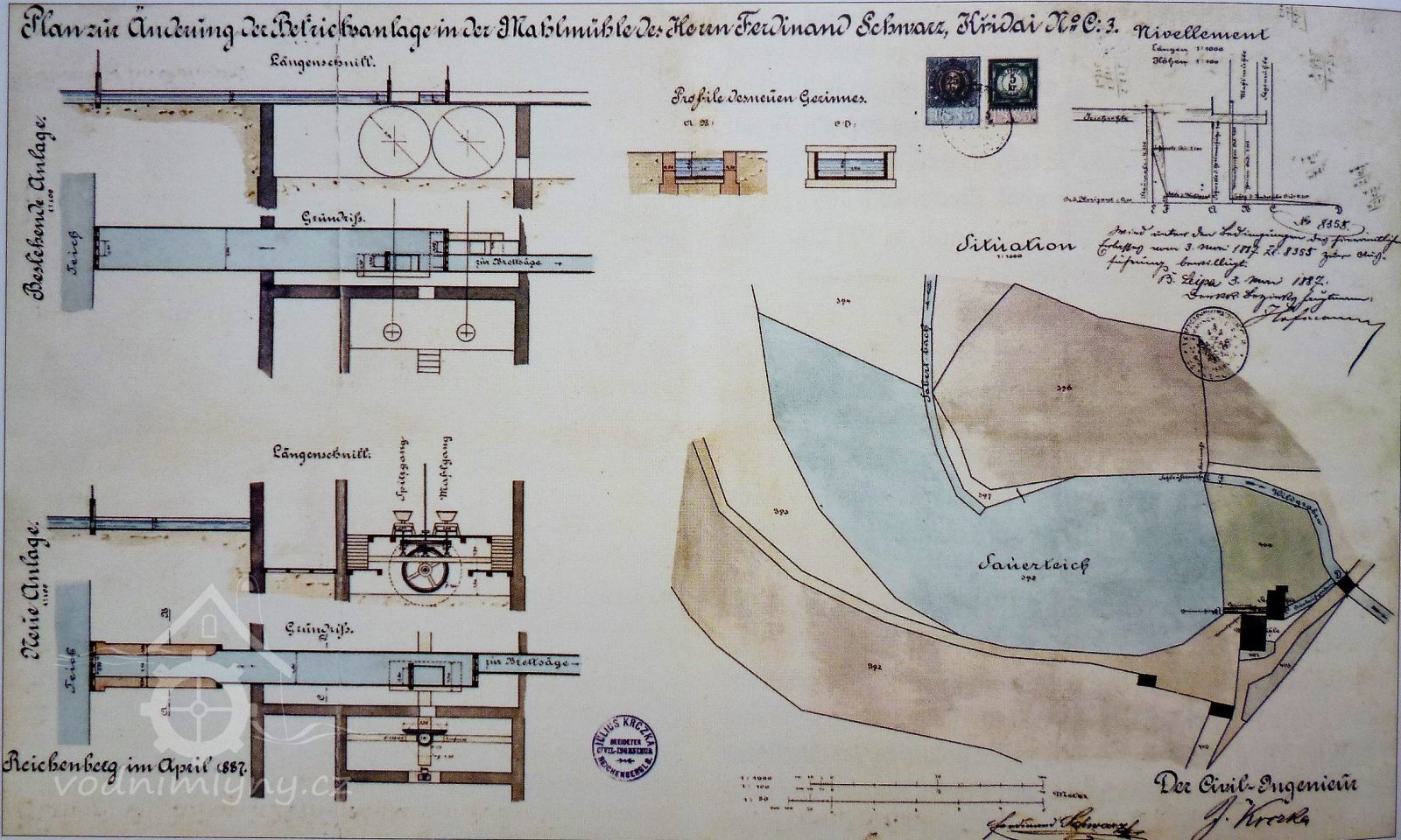 1887: dosavadní 2 kola pro mletí a špicování o prům. 3,5 m a šířce 1,12 m umístěna střídavě za sebou měla být dle projektu libereckého inženýra Julia Krczka nahrazena jedním kolem o stejném prům. a šířce 1,4 m, které by otáčelo palečným kolem o prům 220 cm, které by pomocí pastorku o prům. 76 cm roztáčelo svislou hřídel. Hned nad pastorkem by se otáčelo ještě jedno vodorovné ozubené kolo o prům. 180 cm, které uvádělo do pohybu na každé straně další svislou hřídel pohánějící na mlýnské podlaze klasické složení a špičák (této svislé předlohové hřídeli se říkalo hever). Schváleno 3.5.1887, nadále 2 kola (pro mlýn a pro pilu).