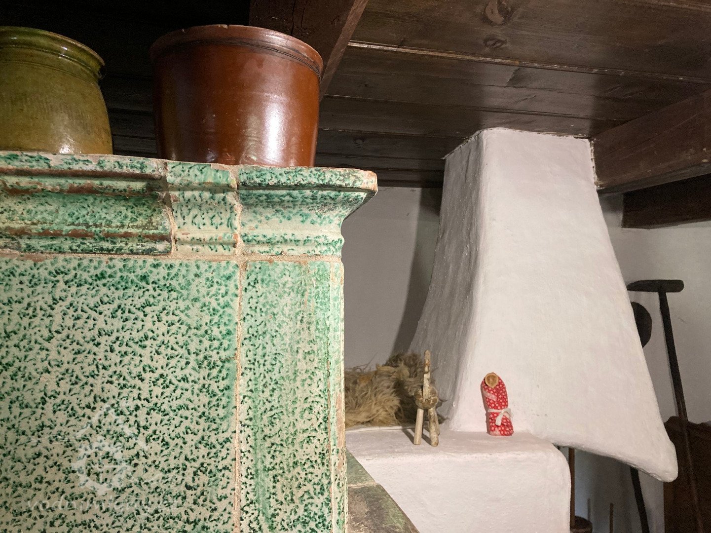 Vedle pece stojí kachlová kamna se sporákem, do něhož se přikládalo dvířky na přední straně a na němž se připravovaly pokrmy v době pozdější. Toto řešení je pro Horňácko neobvyklé, sporák se zde totiž přistavoval zpravidla v černé kuchyni. Navíc je v jizbě vlevo od vstupních dveří ve stěně tzv. krbeček, sloužící k osvětlen