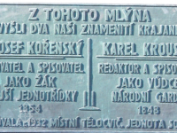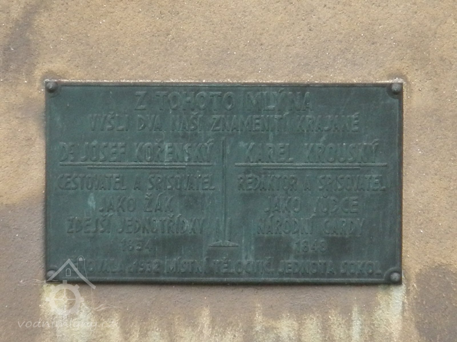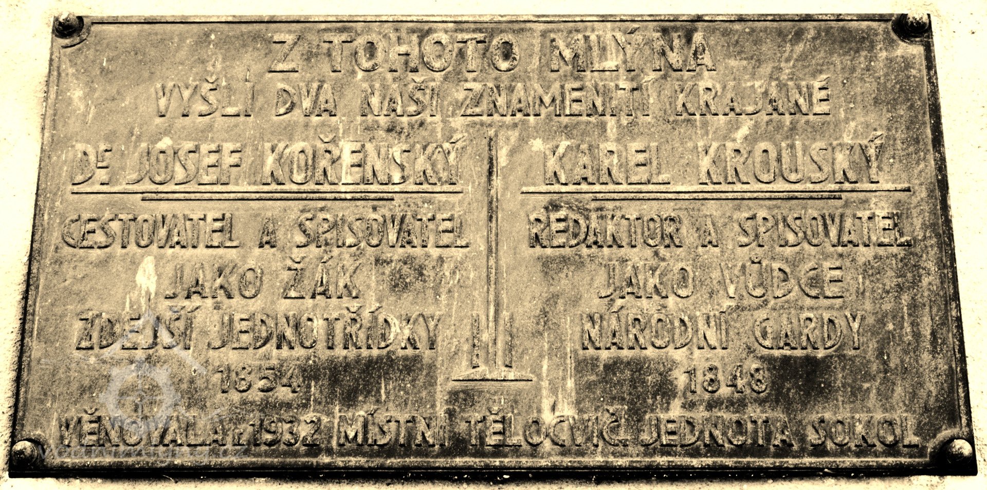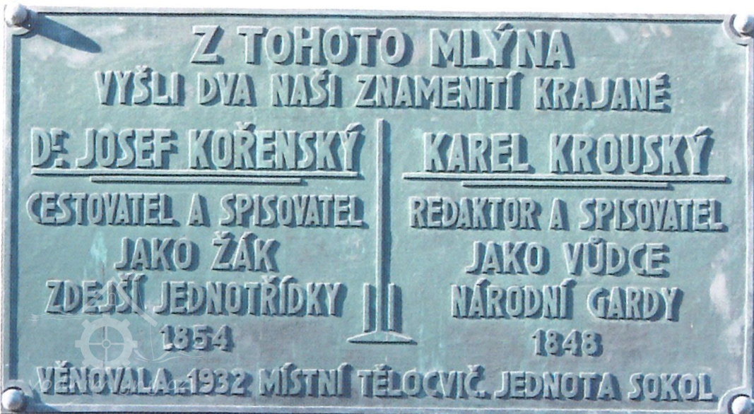 24. srpna 1932 byla na mlýně zasazena pamětní deska jako upomínka na kronikáře Karla Krouského, který odtud pocházel. Stejně bylo vzpomenuto cestovatele Josefa Kořenského, který tu trávil poslední léta života.