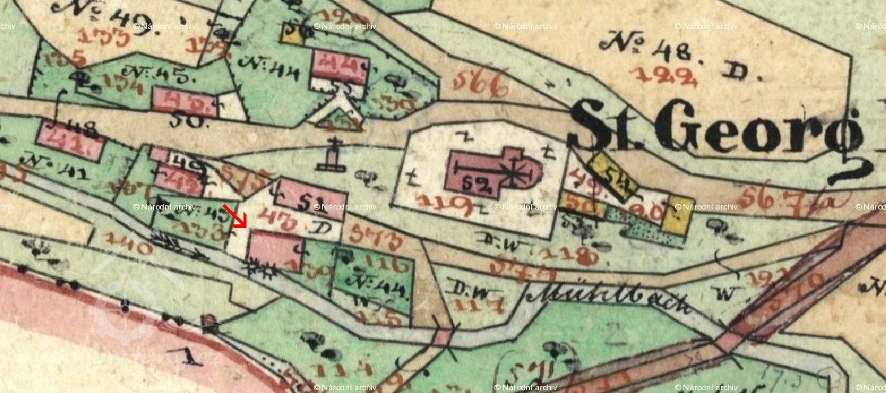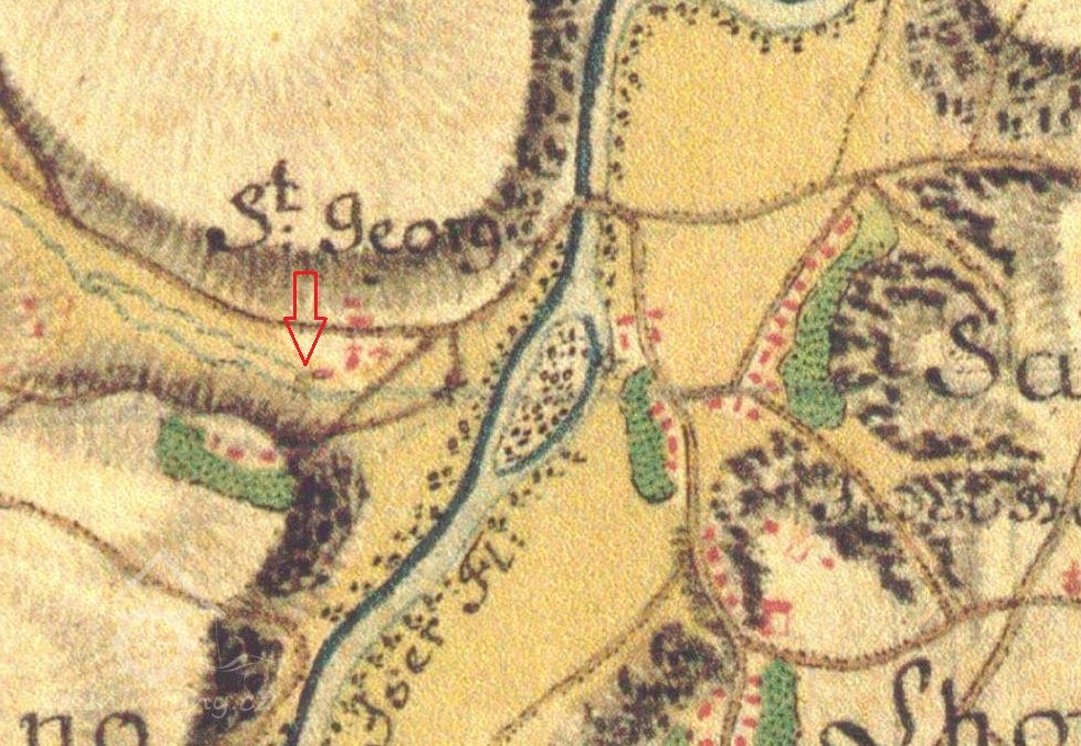Do roku 1785, než byla postavena fara, bydlel na mlýně kromě mlynáře také farář od sv. Jiří. (MH)