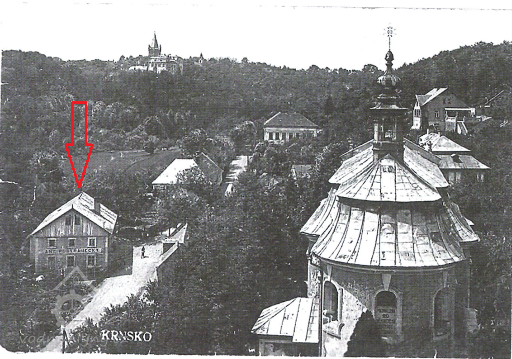 Mlýn je v obci Krnsko pod kostelem sv. Jiří. V pozadí je zámek Stránov.