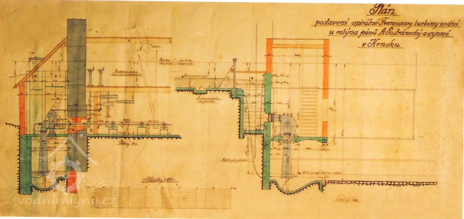 V roce 1923 nechal Antonín Postránecký nahradit vodní kola Francisovou turbínou se spádem 4 m. Turbína byla přímo napojená na transmisi, která poháněla francouzský kámen, složení s českým kamenem a šrotovník. Kamenné složení bylo následně nahrazeno válcovými stolice, a to čtyřválcovou na pšenici a dvouválcovou na žito. (MH)