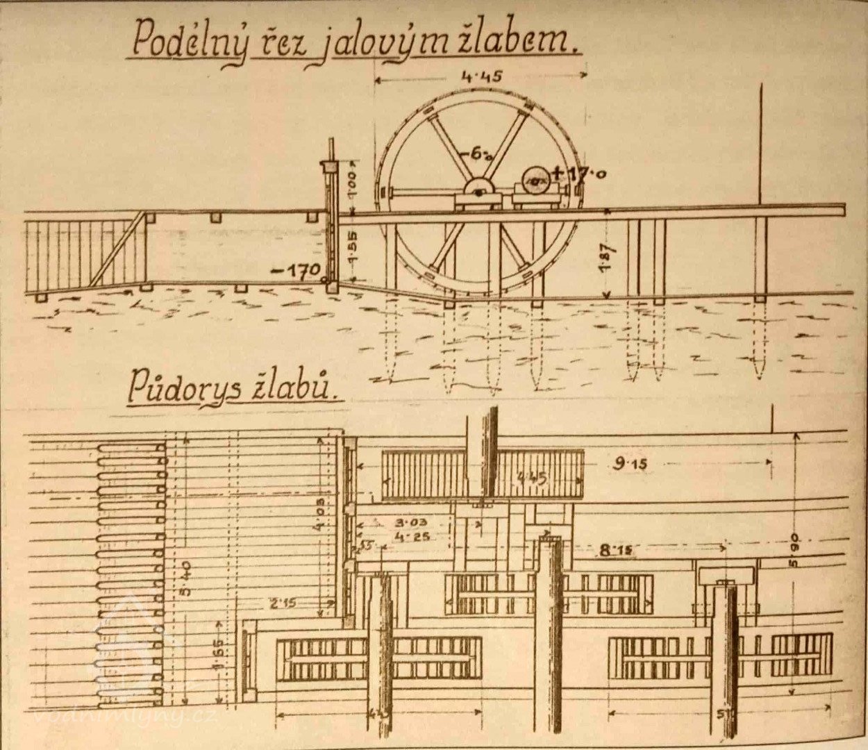 1930: 4 kola na spodní vodu, hltnost 0,69 m3/s, spád 1,5 m, výkon 16 HP