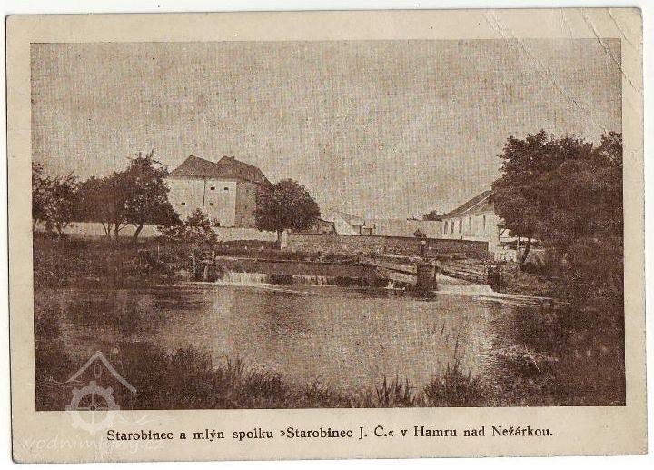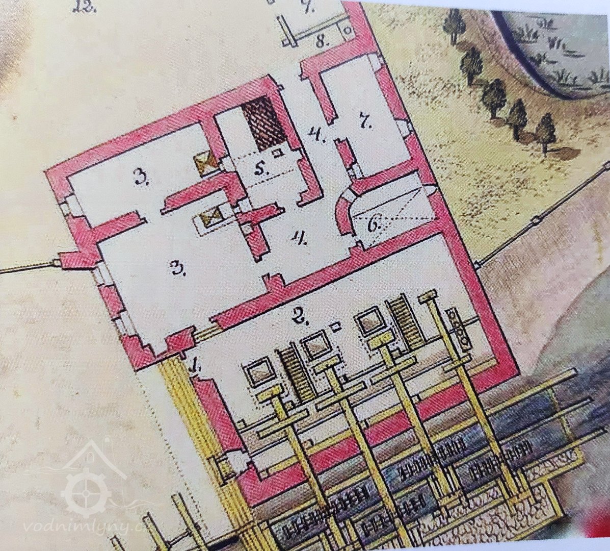 Popis1930: 1 kolo na spodní vodu, hltost 1,5 m3/s, spád 0,86 m, výkon 3,2 HP