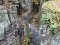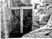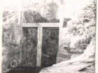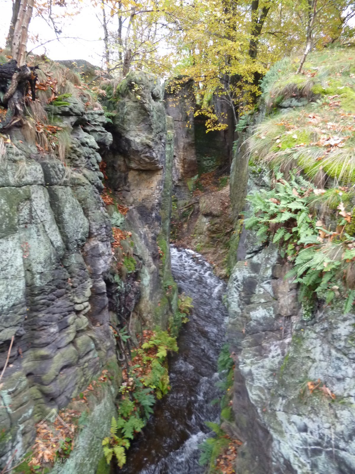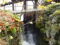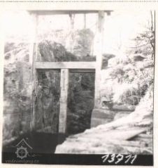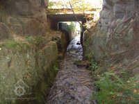 Koryto vytesáno v pískovcové skále. Vysoké 5 m, široké 4 m, dlouhé 30 m. Staré stavidlo, pod dřevěným trámovým mostkem, sestává z fragmentů dřevěných trámů, vpravo od koryta náhon k mlýnu, vybudovaný z pískovcových kvádrů. Mlýn je zbořen. Vpravo u hráze železobeton. konstrukce výpusti, která byla postavena r. 1964 na místě staré dřevěné výpusti.