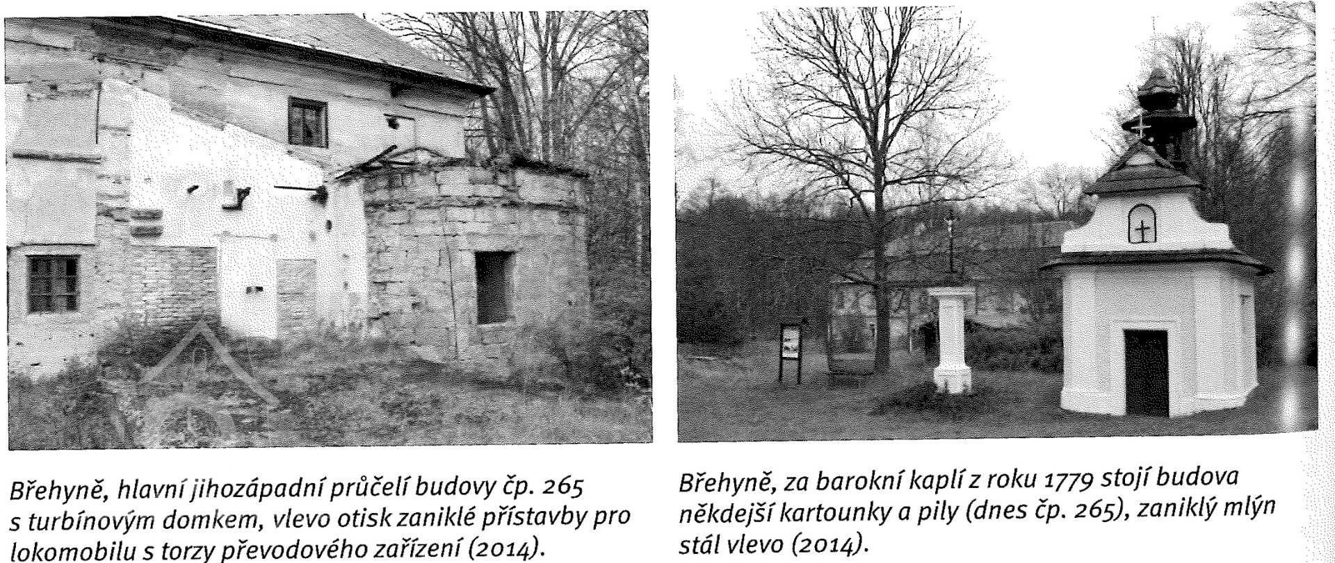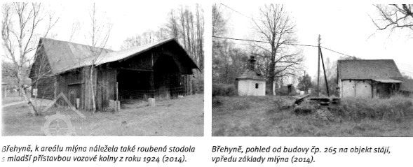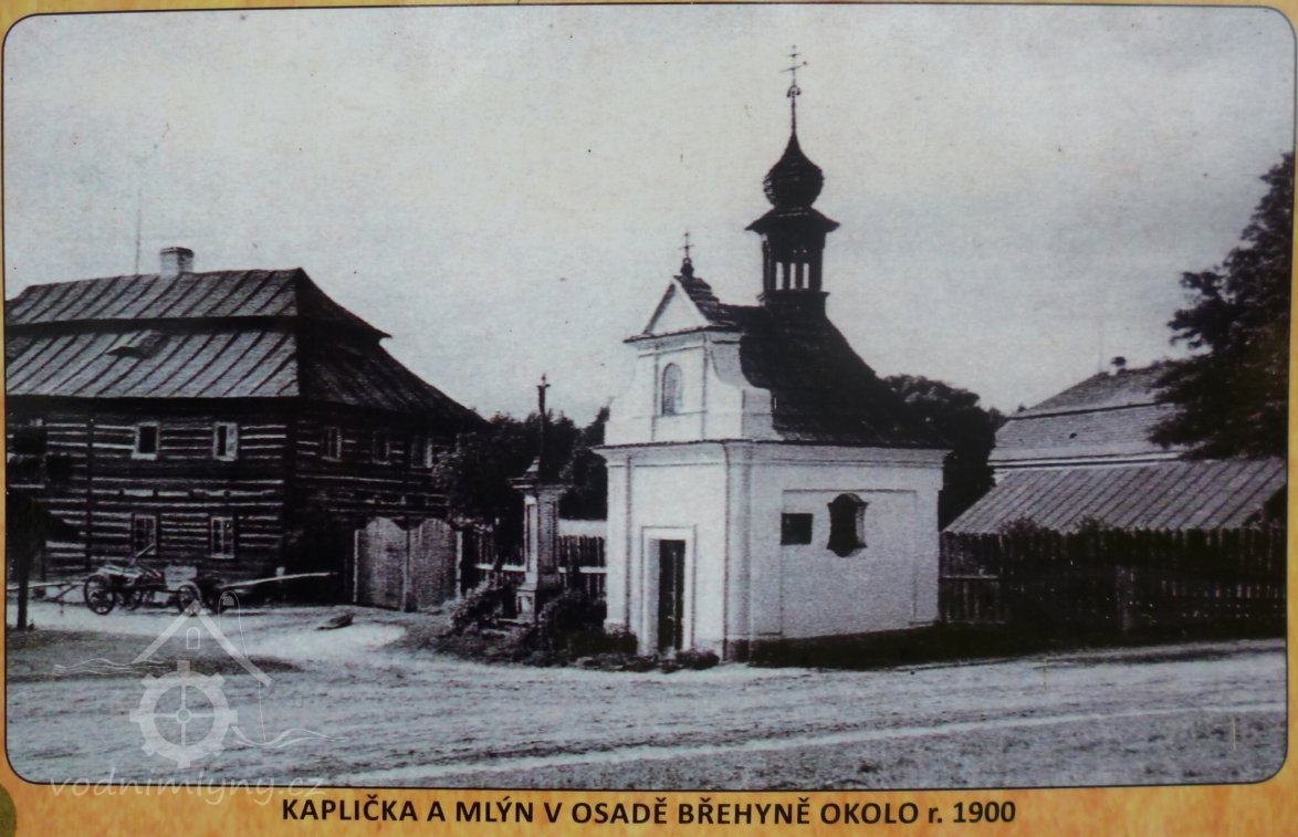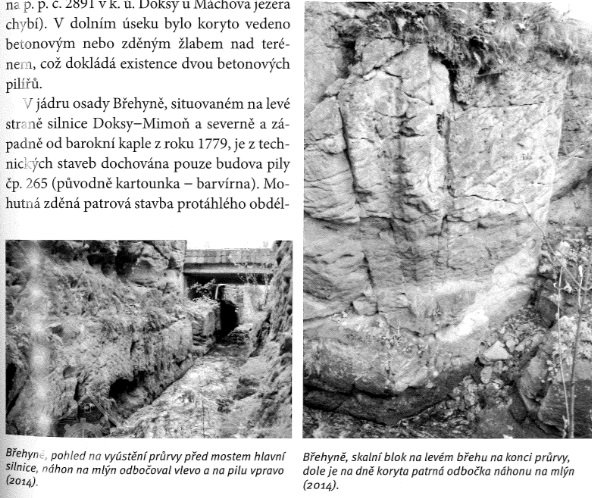Pod někdejším stavidlem se vody z průrvt dělila na dva náhony opro mlýn a pilu. Ístí náhonu pto mlýn je patrné těsně za drázží pro stavidlo na levém břehi. Přisekané skalní položí zabíhá pod těleso silnice a je téměř kompletně zasypané. Na druhé starně silnice pod kaplí vede na pozemcích p.p.č. 2890 a 2892/1 koryto zrušeného náhonu, které je ale čitelné jen lokálně jako mírná prohlubeň. Dnešní hlavní koryto Břehyňského potoka bylo kompletně přezděno a vybetonováno, není patrno umístění původního klenutého silničního mostku ani odbočka náhonu na pilu v pravém břehu pod mostem. V dolním úseku bylo koryto vedeno bettonovým nebo zděným žlabem nad terénem, což dokládá existence dvou betonových pilířů.