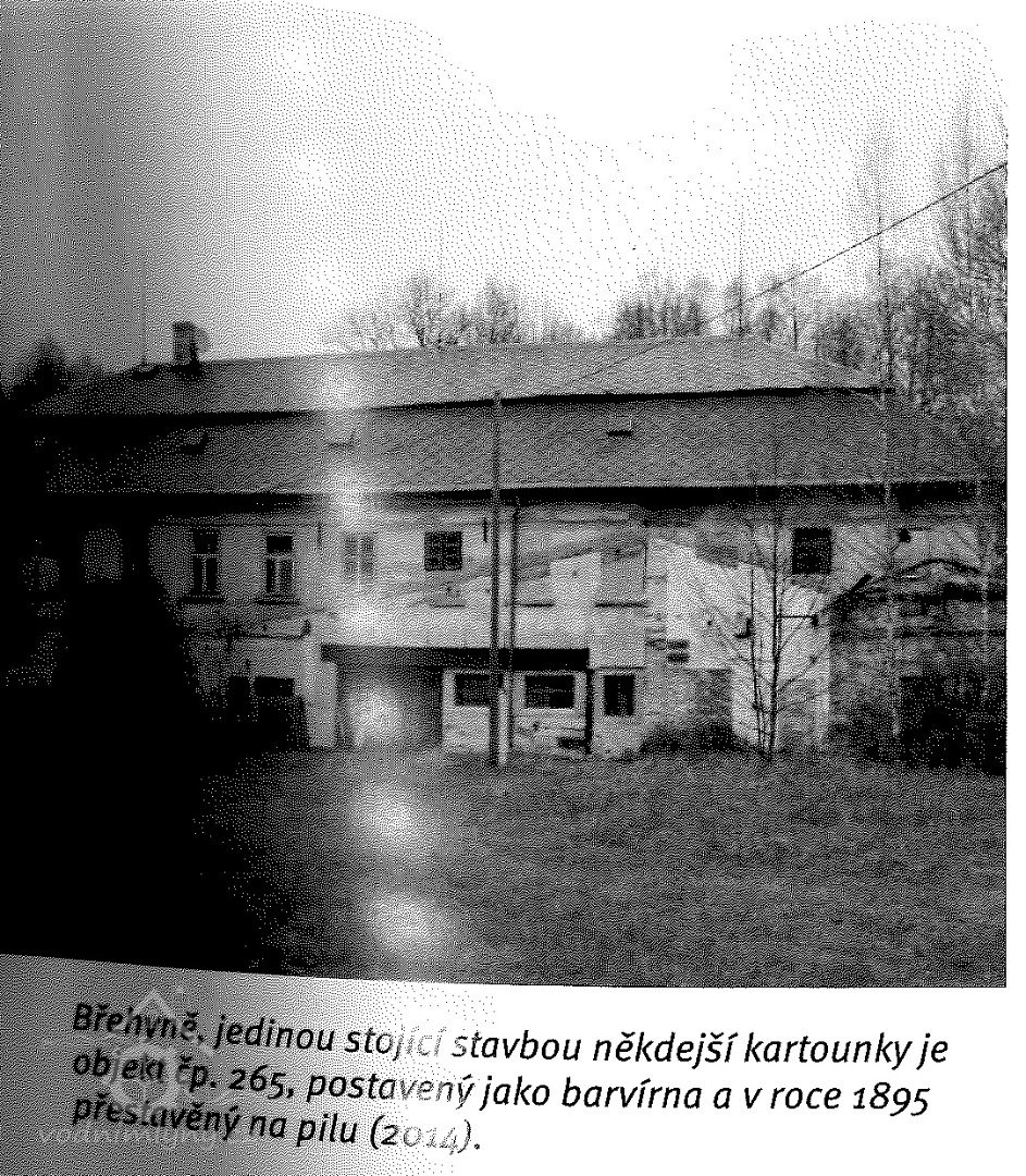 r. 1803 - stavba kartounky, uzavřena nová smlouva s valdštejnskou vrchností ohledně využítí vody z rybníka, z kartounky bude nově platit 100 zl. U barvírny musí být zřízena vyzděná nádrž v délce 8 loktů, šířce 4 lokty a hloubce 3 lokty pro zachytávání odtékající barvy. (Jeden z nejstarších dokladů ochrany životního prostředí - patrně docházelo k neúnosnému znečišťování potoka!)