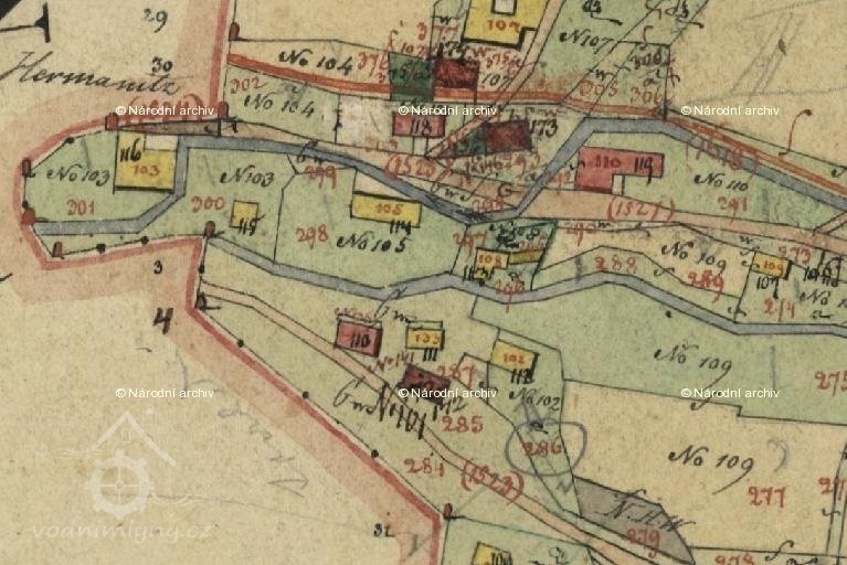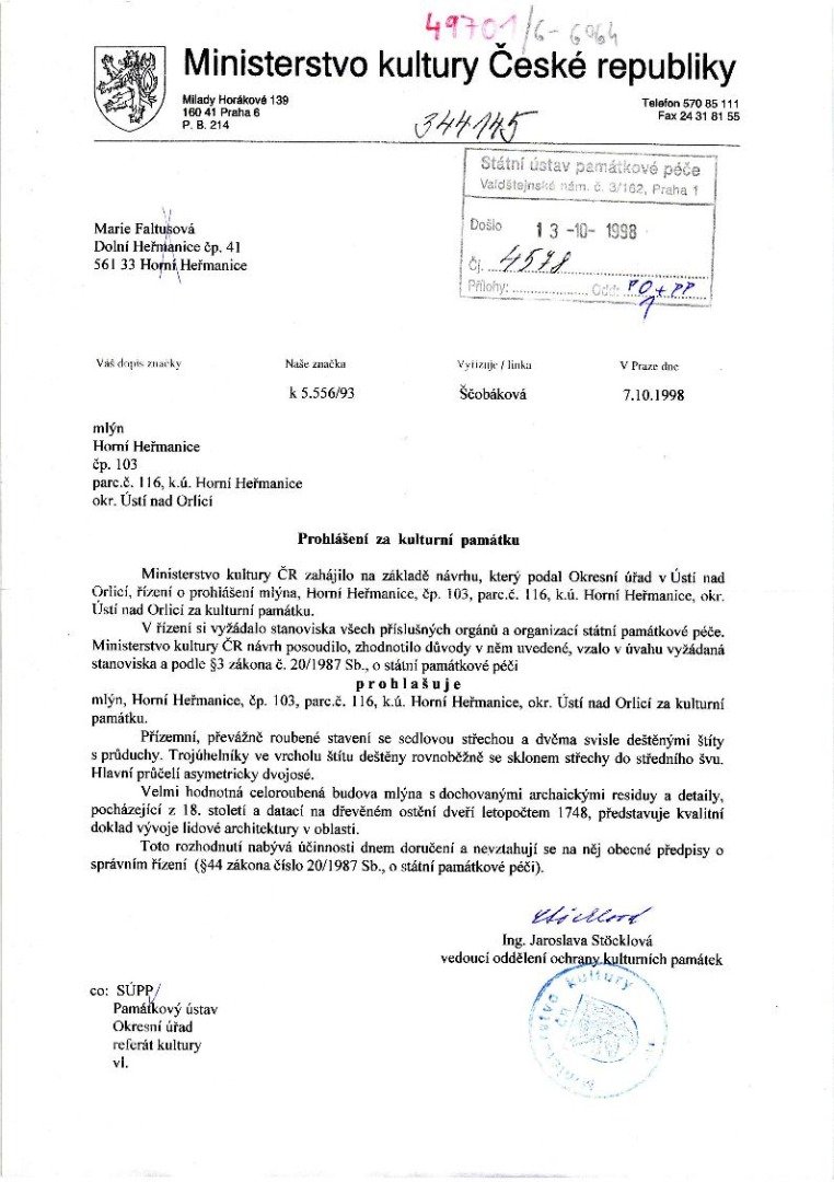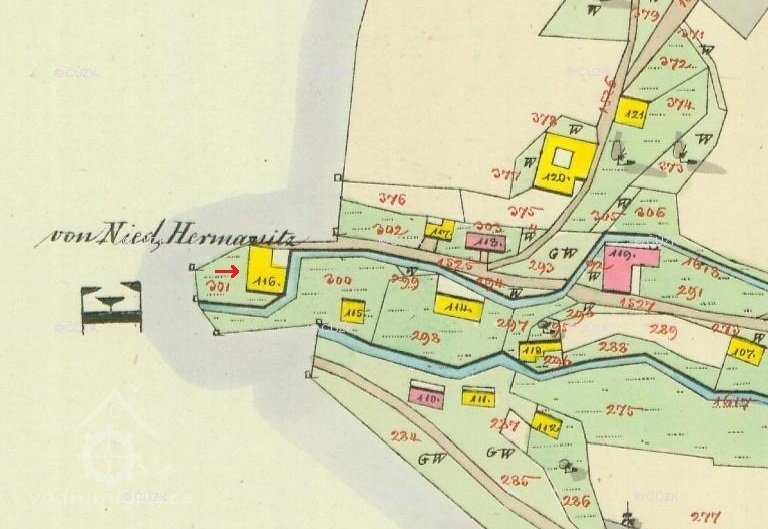 Starý dřevěný mlýn postavený v roce 1748 postavený Ferdinandem Dittrichem, bratrem prvního heřmanického faráře Gotharda Dittricha. Mlýn je dosud v původním stavu. Letopočet výstavby je vyryt na jižní straně nad vchodem ve dřevě a natřen barvou. Mlýn je vystavěn ze silných trámů, jaké se již v okolí nevyskytují. Je to nejstarší dřevěná budova v obci, jejíž stáří je možné přesně určit. Mlýn byl v provozu do roku 1914. V roce 1780 je ve mlýně rod Cinků. Dcera Jana Cinka se provdala v roce 1909 za Josefa Havlenu. Syn Josef převzal budovu v roce 1947. V roce 1982 dědí mlýn manželka a v roce 1987 syn Josef a dcera Marie. Současným majitelem je Josef Havlena.