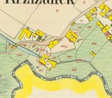 V roce 1839 zachycuje areál mapa stabilního katastru. Zaznamenává jak mlýn [stavební parc. č. 3], tak pilu [stejná stavební parc. jako mlýn]. Mlýn, pila i hospodářské objekty tvořící celý areál usedlosti jsou na této mapě vyznačeny žlutou barvou, tedy vybudované ze spalných materiálů. Symbol vodního kola zde není použitý obvyklým způsobem jako polovina kola s lopatkami bezprostředně navazující na půdorys mlýnice, ale naopak uprostřed celé mlýnské usedlosti a jako kolo s lopatkami celé. Vzhledem k tomu, že na této mapě voda není v prostoru areálu mlýna vyznačena, musela být již tehdy uzavřená v kanálu – snad shodném z velké části s kanálem dosud dochovaným – procházejícím podélně areálem staveb.