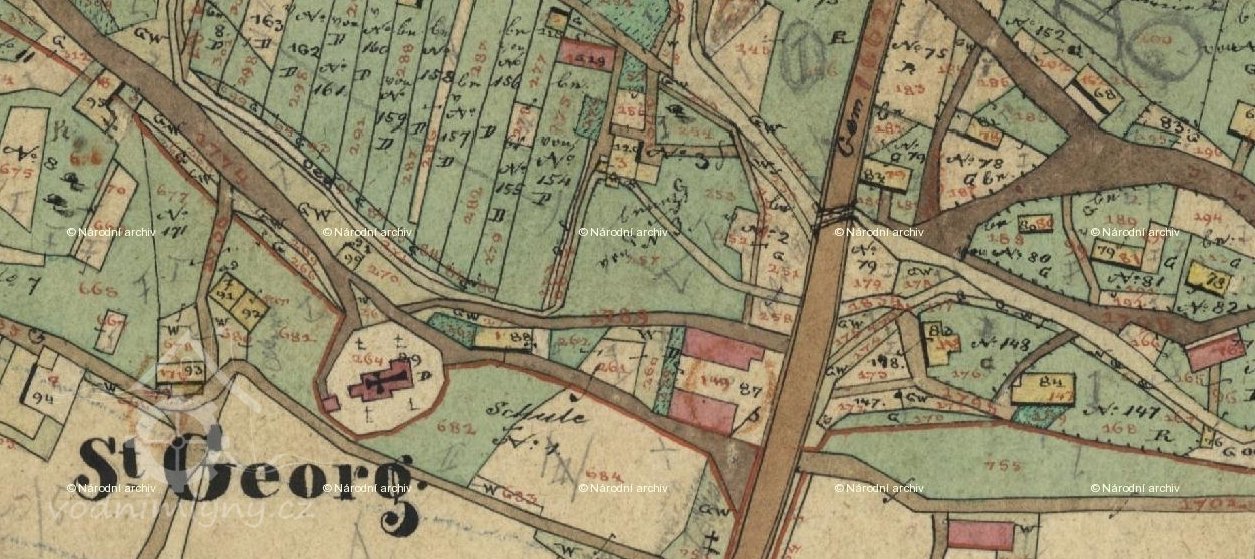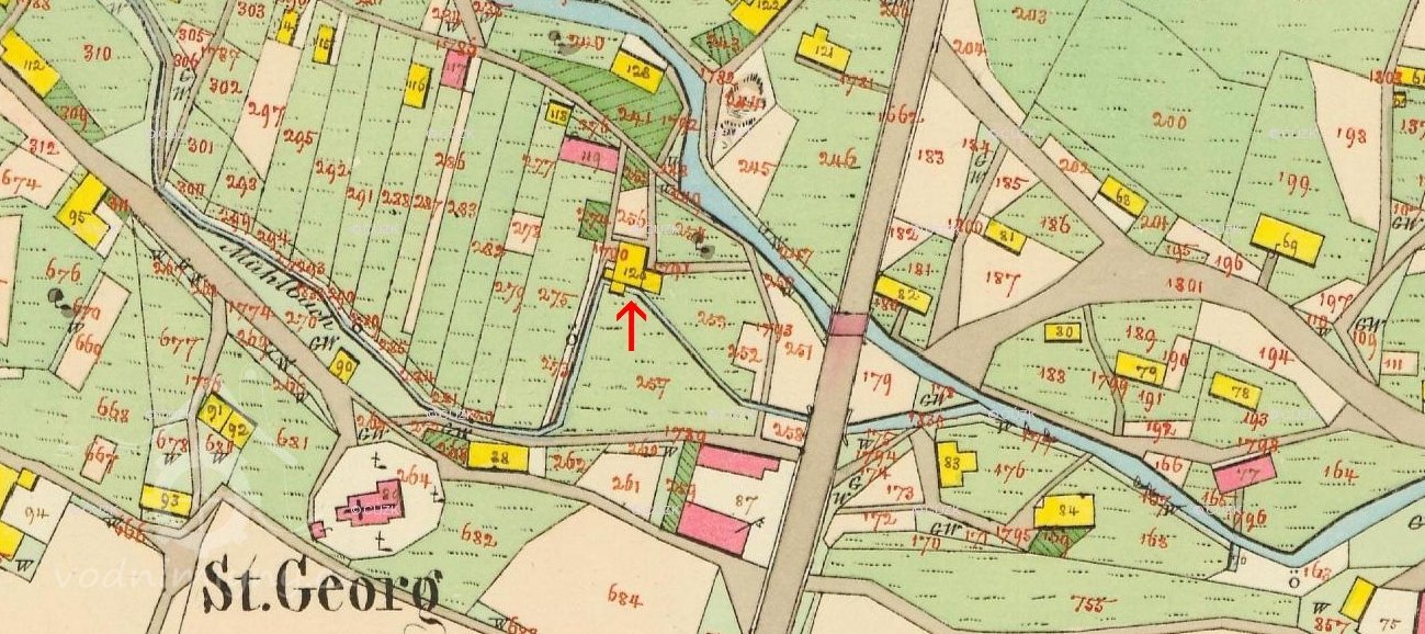 Mlýn se nachází 100 m severovýchodně od kostela sv. Jiří.